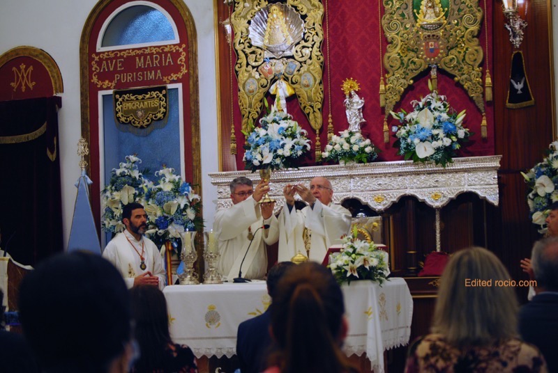 Las hermandades de Huelva y Emigrantes terminan un Rocío “distinto” que han vivido más unidas que nunca con una emotiva Misa de acción de gracias concelebrada por el obispo de Huelva, José Vilaplana, y los capellanes y directores espirituales de ambas hermandades, José Antonio Omist y José Manuel Barral, respectivamente y que contó con el acompañamiento musical de Raquel Martínez y Abraham Cruz.