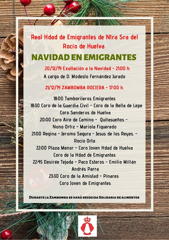 Al día siguiente, el sábado 21 de diciembre, Emigrantes celebrará a partir de las 17:00 horas su Tradicional Zambomba Rociera en la que tomarán partido más de una veintena de grupos, Coros y Solistas que entorno a una gran candela, cantarán a la navidad llenando de magia y color el patio de una hermandad que prevé una alta participación de público. Regina, Jeromo segura, Jesús de los Reyes, El Coro de Emigrantes o Senderos de Huelva, serán alguno de los artistas que colaborarán en esta edición de una Zambomba Rociera que presenta un cambio importante en su organización, ya que pasa de celebrarse en horario en horario nocturno a comenzar en torno a las 17:00 horas facilitando así la participación de toda la familia en uno de los actos sociales más populares de la navidad en la capital onubense. Durante toda la jornada se realizará una recogida solidaria de alimentos y utensilios de primera necesidad que serán recepcionados a la entrada de la Casa Hermandad.