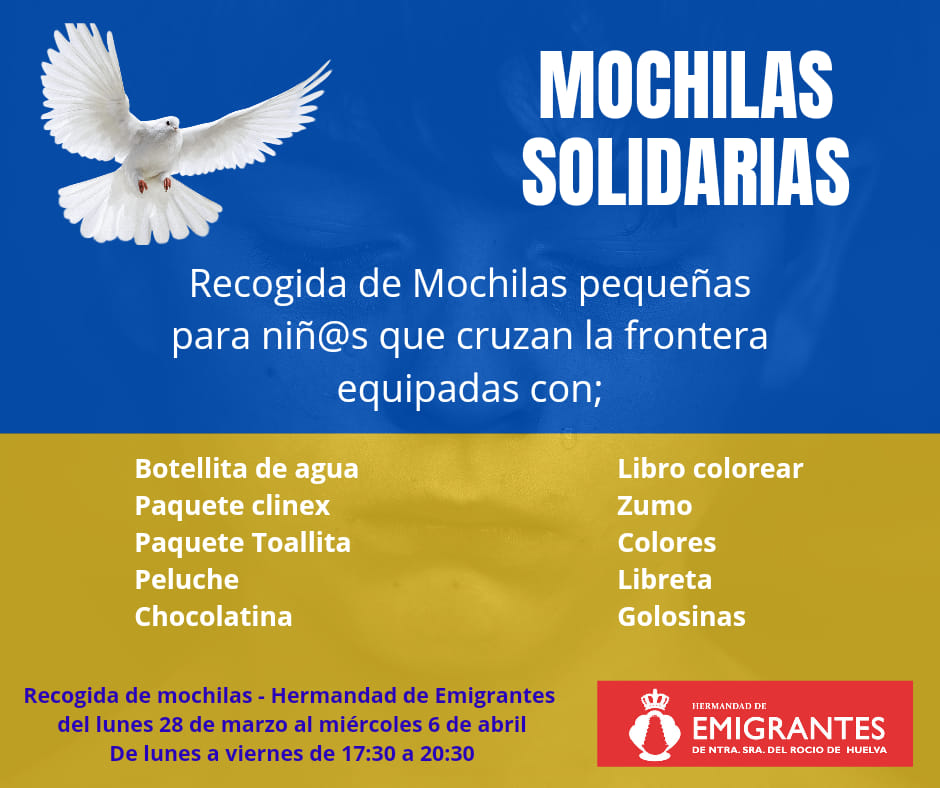 La Real Hermandad de Emigrantes de Nuestra Señora del Rocío de Huelva, a través de Miguel Angel Gutiérrez Peguero, vocal de Caridad y Relaciones Fraternas, y un nutrido grupo de hermanos y devotos de la filial rociera se han propuesto ayudar en todo lo posible a mitigar el sufrimiento de los muchos niños que se están viendo obligados a dejar su país tras la invasión de Rusia y para ello han puesto en marcha la campaña ‘Mochilas solidarias’.