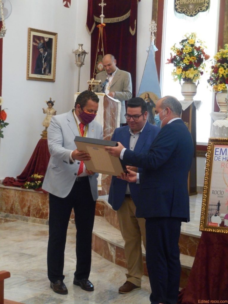 El teniente alcalde de Cultura del Ayuntamiento de Huelva, Daniel Mantero, disculpó la ausencia del alcalde de Huelva, Gabriel Cruz, debido a que en esos momentos se encontraba atendiendo asuntos relativos a la actual crisis. Mantero no pudo evitar lamentar que “este hubiese sido su primer camino desde que ocupa su cargo en el Consistorio onubense”, admitiendo “el cariño que tiene a esta hermandad”. No obstante, cree que “este año pasará a la historia”. Cree que “Emigrantes inició su camino con la cesión de sus instalaciones para que en ella se estableciera un punto de desinfección de Epis. No vamos a pisar las arenas, pero se está trabajando desde el primer día para ayudar a superar esta crisis”.