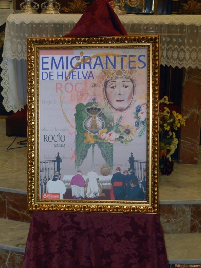 “El cartel está realizado en composición fotográfica con tratamiento digital, utilizando diferentes formatos, trazos y formas”, como ha explicado José María Palma. El mismo, ha manifestado su autor, “recuerda la visita que el Papa Juan Pablo II, hoy Santo por la gracia de Dios, realizara en 1993 al santuario de la Santísima Virgen del Rocío. En la escena contemplamos la imagen de San Juan Pablo II arrodillado junto al pueblo de Huelva representado en el clero diocesano y fieles, portando uno de ellos la medalla de la hermandad en su mano. San Juan Pablo II reza las letanías del Santo Rosario, que se pierden en el fondo de la escena, frente al Simpecado de la Hermandad de Emigrantes que se deja averiguar en su silueta resaltando especialmente la Concha Peregrina, símbolo y emblema de esta hermandad”.