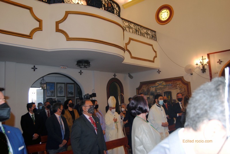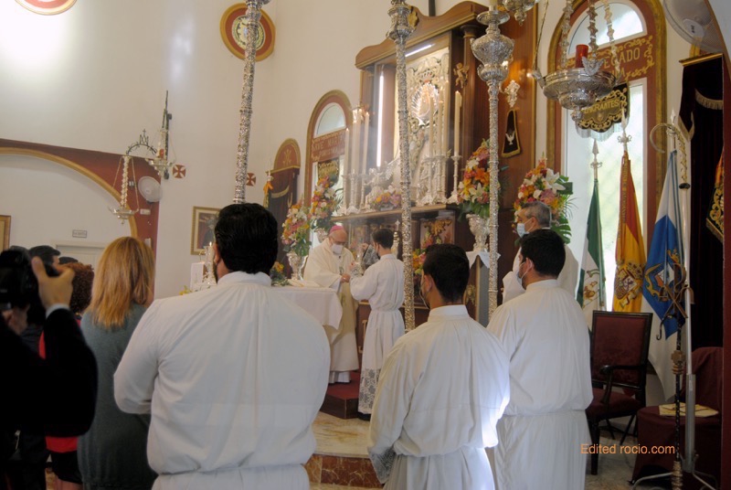 Mañana espléndida con sones de flauta y tamboril que salían del patio de la casa de la Real Hermandad de Emingrantes de Nuestra Señora del Rocío de Huelva para dar la bienvenida al obispo de Huelva, Santiago Gómez Sierra, quien visitaba por primera vez la casa de la Concha Peregrina para presidir la Misa de Acción por el cincuentenario de esta filial rociera que naciera en la ciudad alemana de Bocholt.