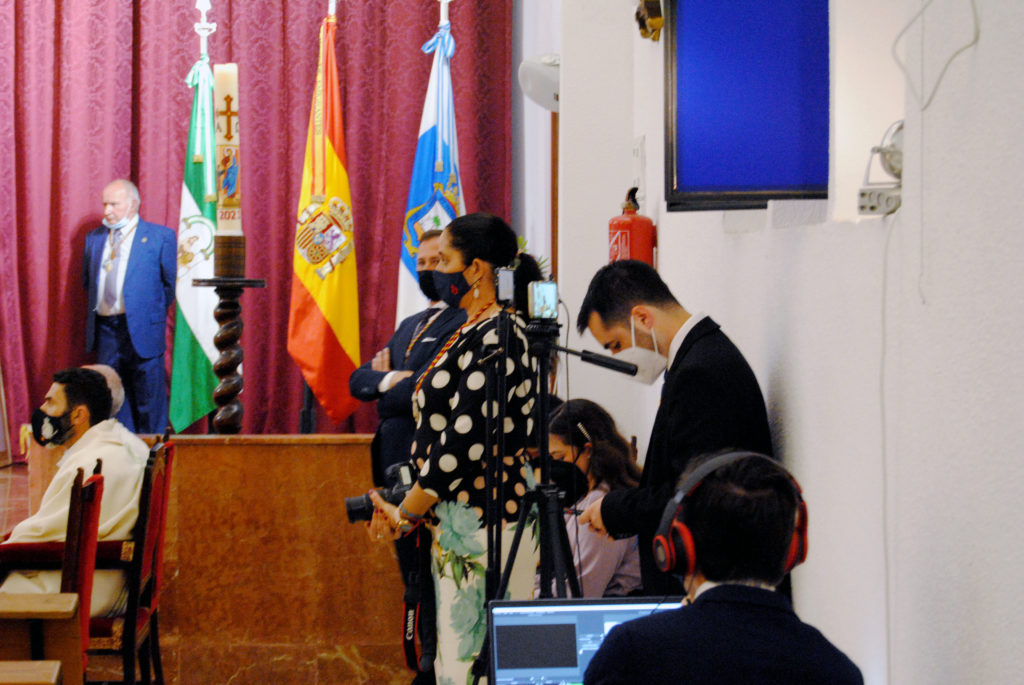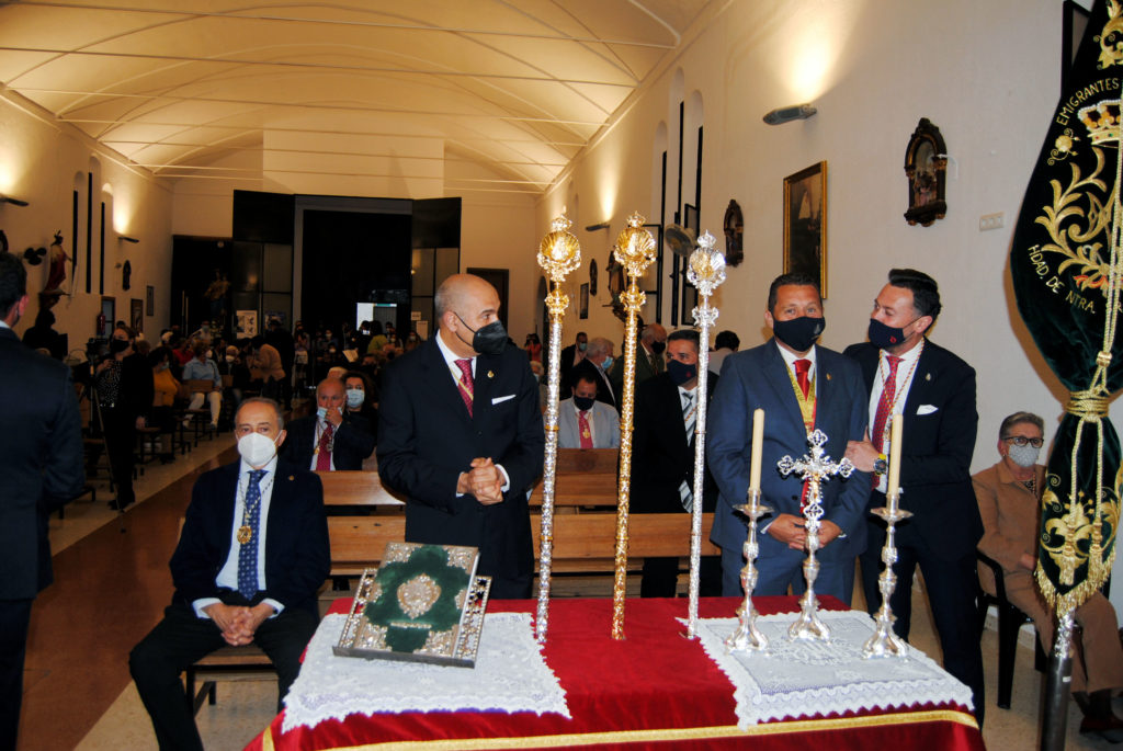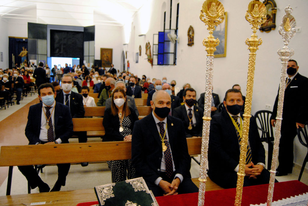 Martínez iniciaba su mensaje dando la bienvenida al presidente, junta de gobierno y hermano mayor de Emigrantes, hermano mayor y junta de gobierno de La Lanzada y la Virgen de los Dolores, antiguos hermanos mayores de la filial rociera, hermanos y hermanas todos en el Señor.