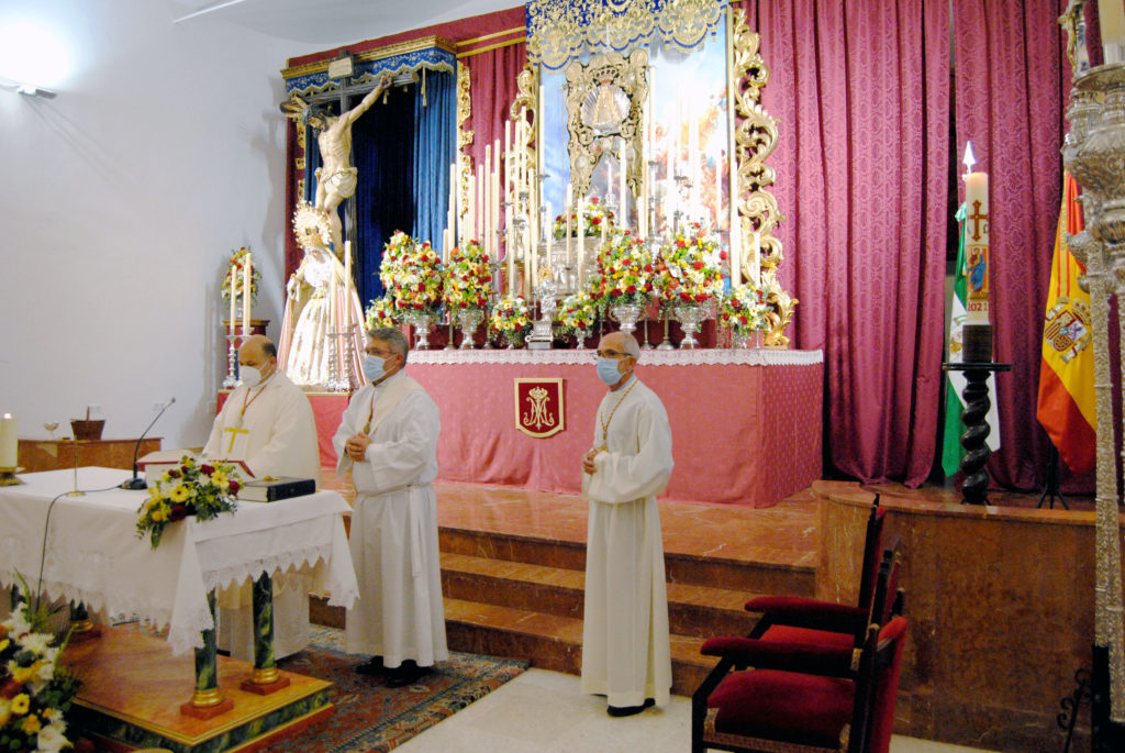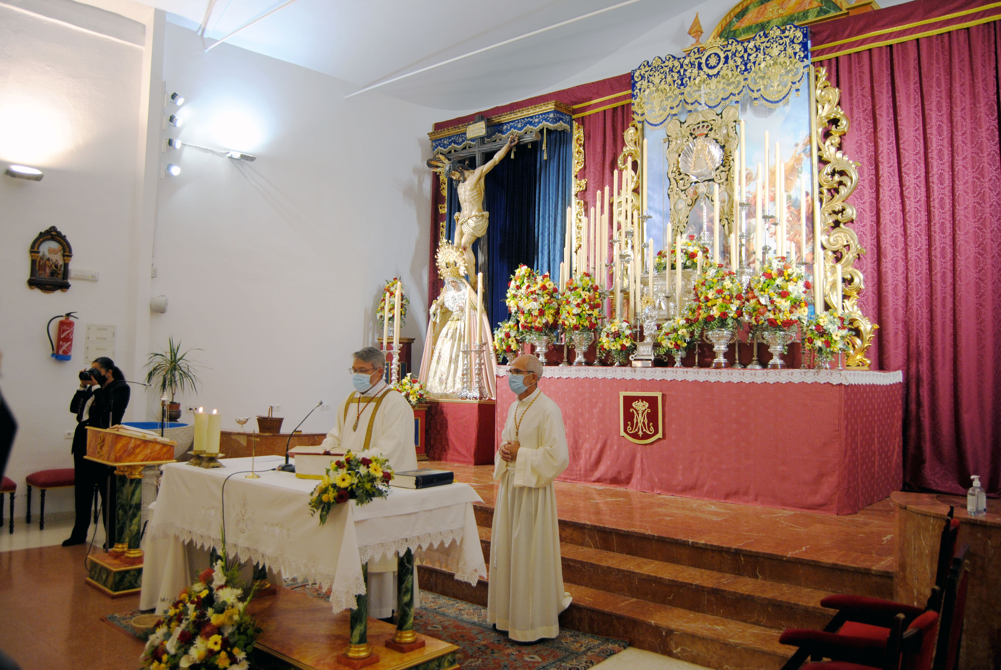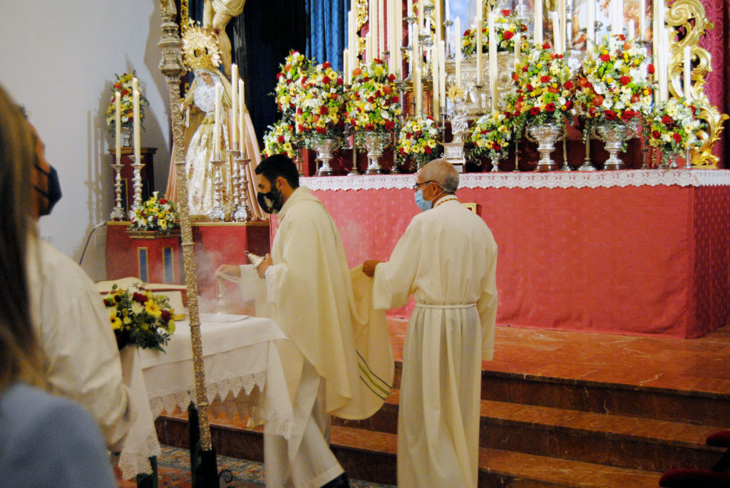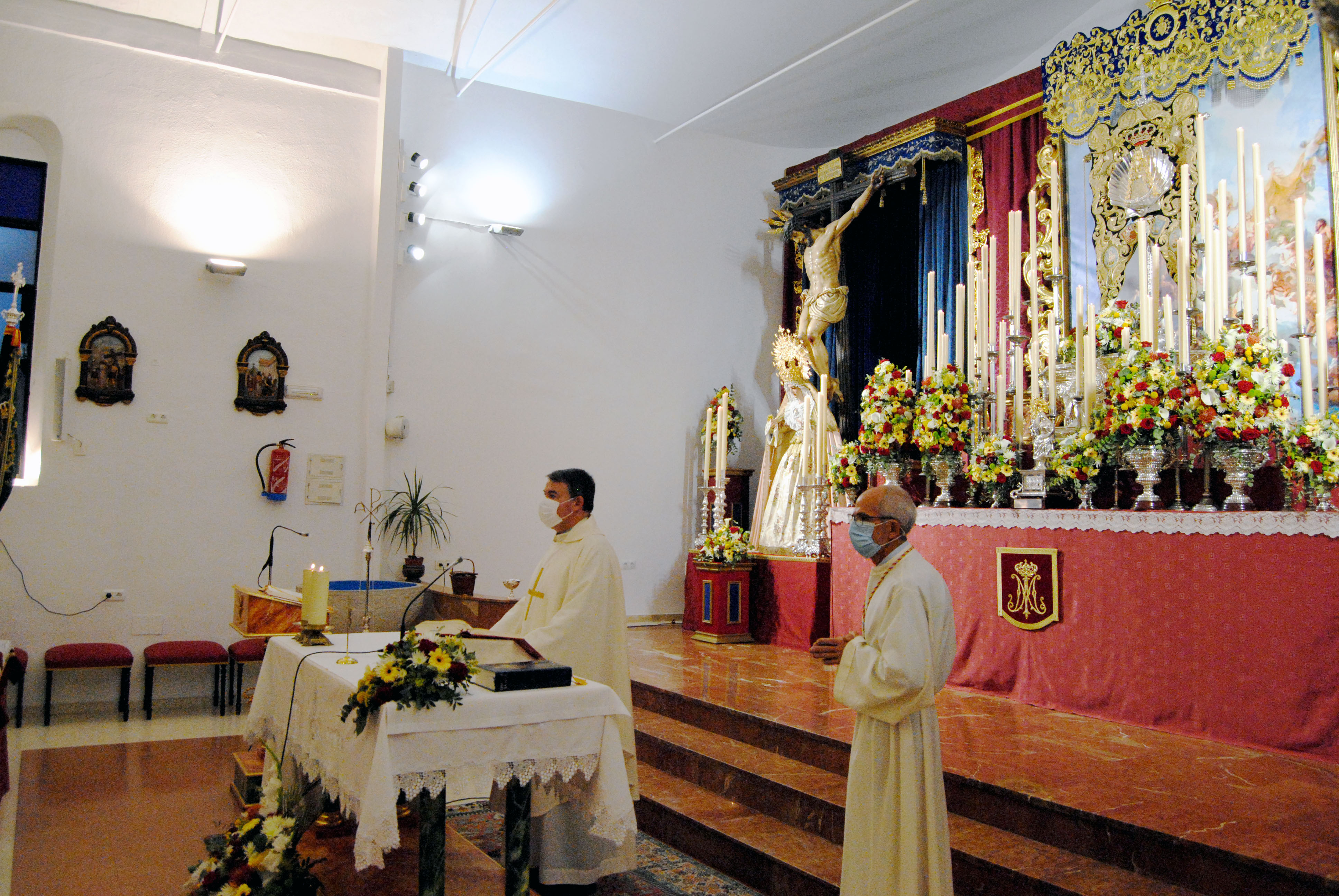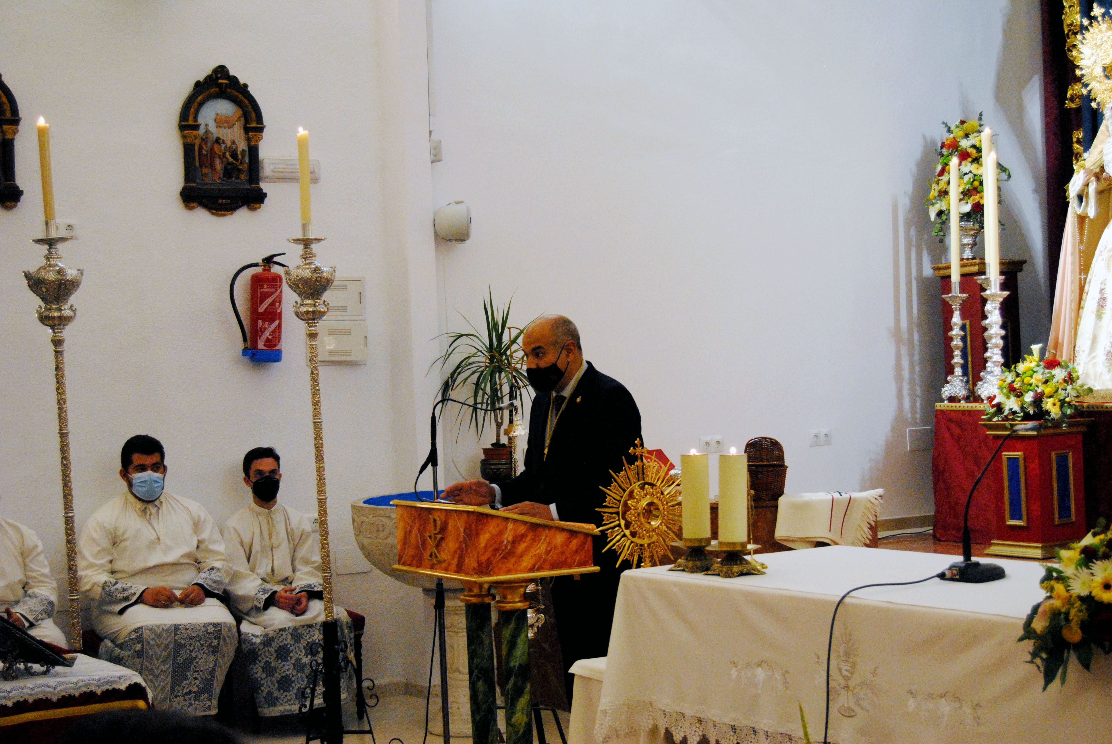 La sagrada cátedra de esta segunda jornada de triduo ha corrido a cargo del reverendo Andrés Martínez, párroco de la iglesia Cristo Sacerdote, acompañado por el diácono permanente, y hermano de la entidad, Amador Martínez, y el vocal de Cultos y Espiritualidad, José Antonio Gallardo.