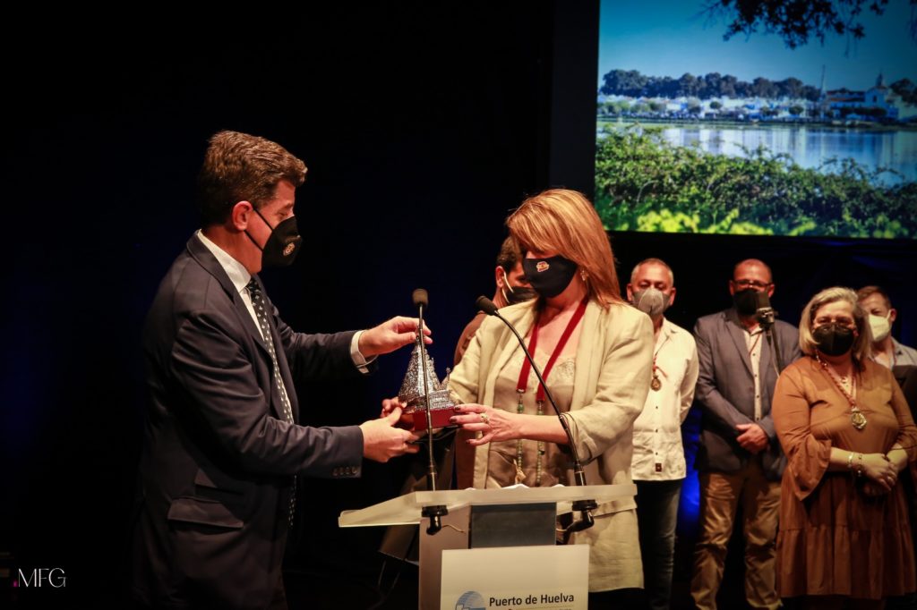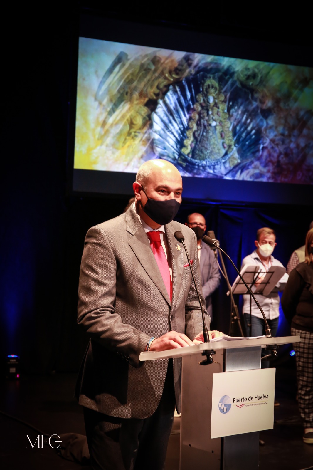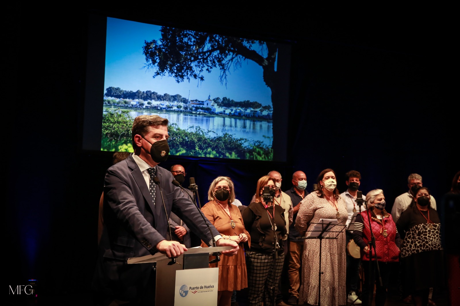 Nacho decía que tenemos “el puerto más rociero que hay”, antes de dar la palabra al presidente de la Hermandad de Emigrantes, Francisco José Garrido, quien recordaría los 50 años de la filial rociera que preside, recordando “los 50 años que Emigrantes camina por la senda de la fe bajo el manto y protección de Nuestra Madre del Rocío”. “Han sido muchos los caminos desandados por Emigrantes con su Simpecado, pintado por Matías Aceitón”: Bolchot, gracias a un nutrido grupo de onubenses en aquellos encuentros campestres, Madrid, Sevilla, Huelva a finales de los años 60, Aljaraque, donde nació como hermandad y filial rociera y de nuevo Huelva para quedar ubicado en el popular barrio de las Colonias donde creció como hermandad y su trasladó definitivamente en 1998 a su sede del paseo de las Glorietas. “Han sido 50 años de ilusión, 50, años de fe, 50 primaveras caminando bajo el amparo y protección de la Reina de las Marismas, 50 años de fe para postrarse a los pies de la Blanca Paloma. Es imposible referirse sin olvidarse de la visita a su Simpecado de su alteza real la Reina doña Sofía, la visita del Papa Juan Pablo II, la concesión de la medalla de Huelva por el entonces alcalde de la ciudad Juan Ceada Infantes. En sus años de historia Emigrantes ha creado su identidad propia, muy singular. Es imposible referirse a Emigrantes sin acordarse de Paquita, Cristóbal, … de todos aquellos rocieros que años tras años se trasladan a la aldea con sus carros cuajados de flores de papel como ofrenda de amor a Nuestra Madre, es imposible referirse a Emigrantes y no tararear ninguna de las sevillanas de nuestro querido Joseli, Es difícil hablar de Emigrantes sin recordar al tío Carlos, a la familia Arestoy, a Juan Gil Zamora, a la gente de El Rompido, a los Brioso, a los Ortiz, Barneto, Polo, familia Palanco. Es imposible hablar de Emigrantes y no acordarnos de Eduardo Fernández Jurado, toda una institución en Huelva y en el mundo rociero, pregonero incansable del Rocío y que nos dejó el pasado año 2019 siendo presidente de esta hermandad. Hablar de Emigrantes es hablar de las hermanas Oblatas, de la plaza de Los Dolores, de su Mensajera, del miércoles de ‘amanecía’, Venancio y Manoli, de Almonte de sus sones de campanillas cruzando los senderos, Tres Rayas,…”.