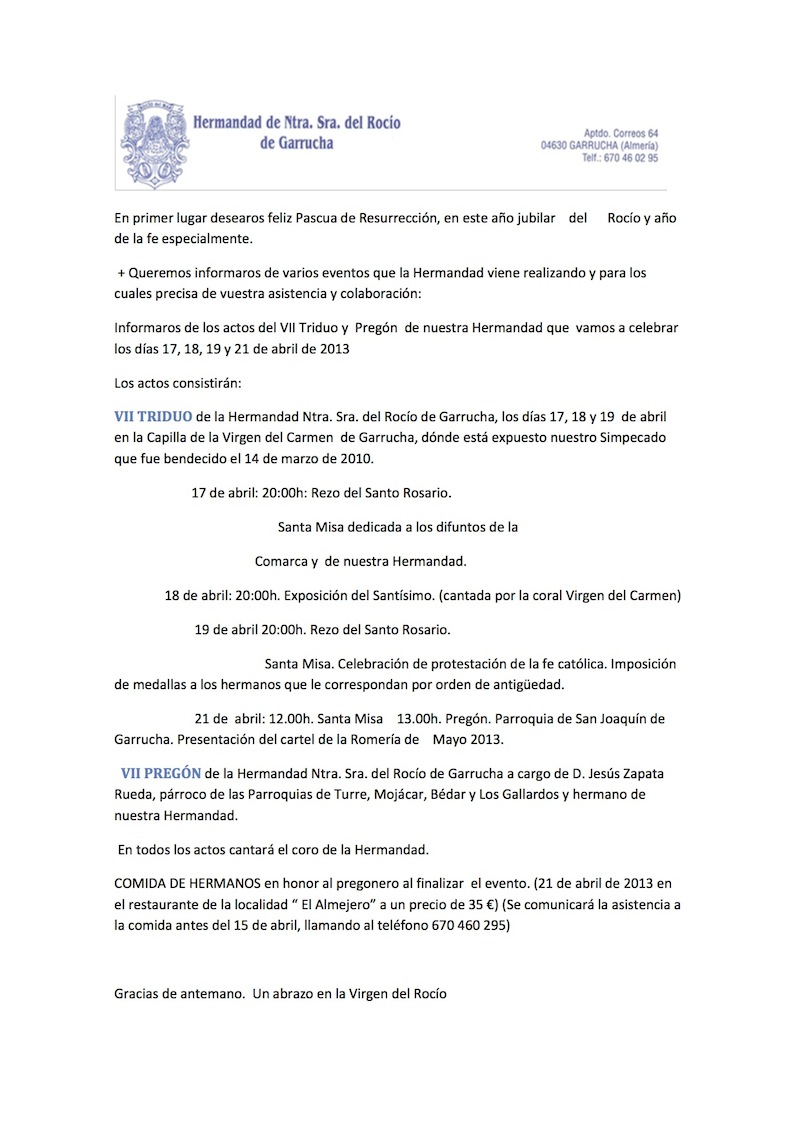 Hdad. de Garrucha – VII TRIDUO de la Hermandad Ntra. Sra. del Rocío de Garrucha, los días 17, 18 y 19 de abril en la Capilla de la Virgen del Carmen de Garrucha