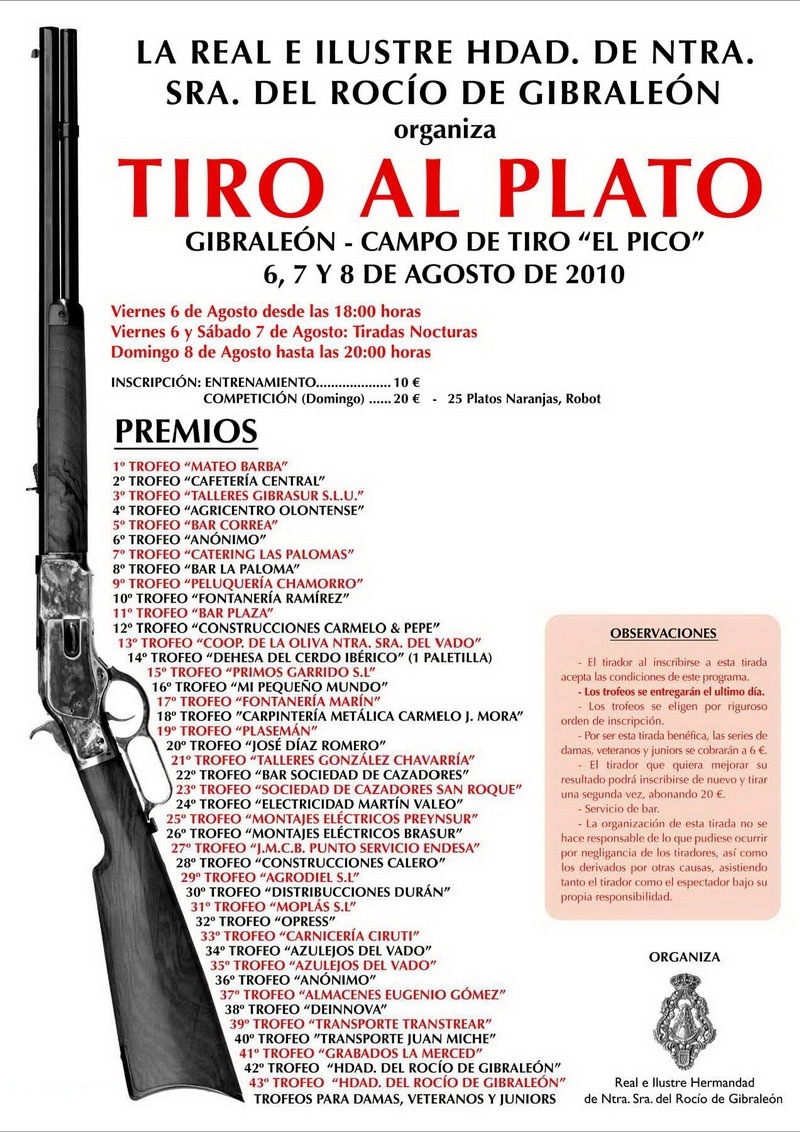 LA REAL E ILUSTRE HDAD DE NTRA SRA DEL ROCIO DE GIBRALEÓN, ORGANIZA LA III TIRADA AL PLATO, LOS DÍAS 6, 7 Y 8 DE AGOSTO DE 2.010.