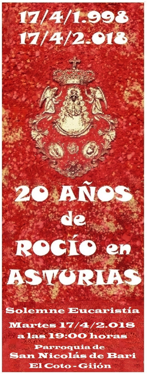 20 Años ya que empezó a caminar nuestra Hermandad del Rocío de Gijón. 20 Años con Ilusión y el esfuerzo de los rocieros asturianos, siempre guiados y protegidos por Ti, paso a paso llegamos a tus Plantas Virgen del Rocío