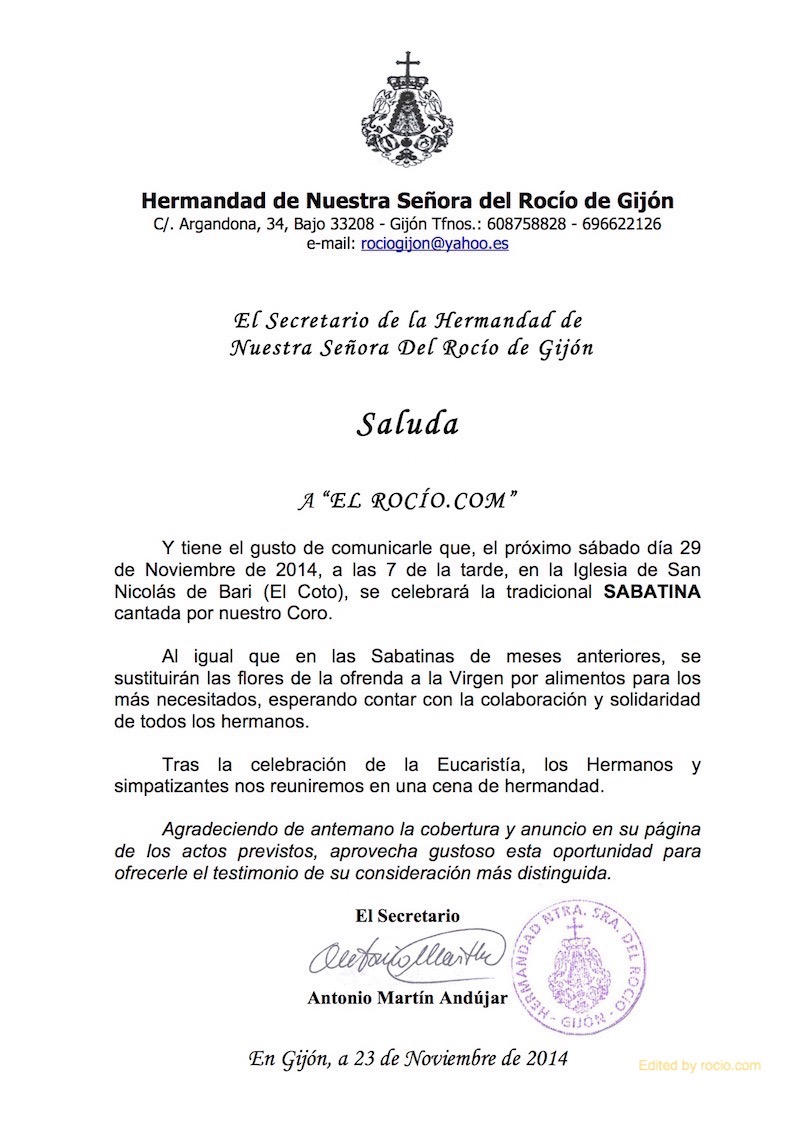 La Hermandad de Gijón celebrará su Tradicional Sabatina el próximo sábado día 30 de noviembre.