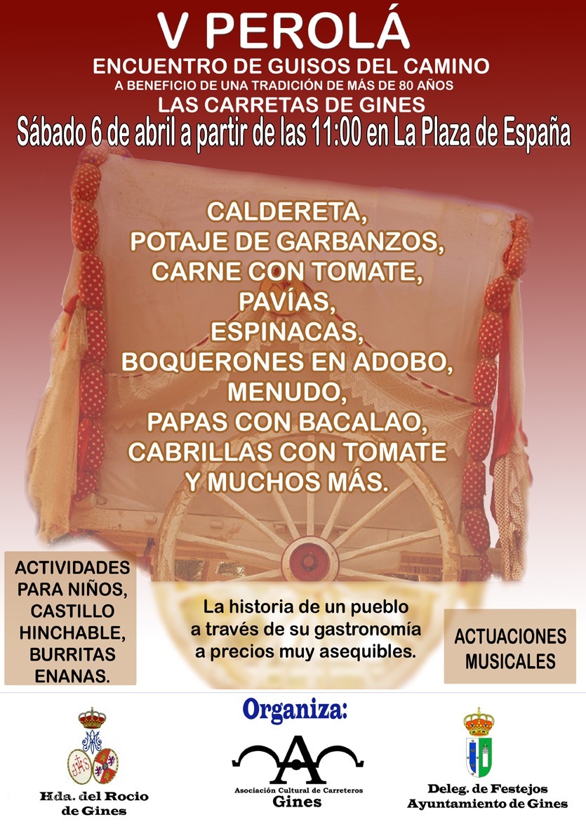 Con una gran afluencia de público se celebró este sábado la quinta edición de la “Perolá, Encuentro de Guisos del Camino”, una iniciativa organizada de manera conjunta por la Hermandad del Rocío de Gines, la Delegación de Festejos del Ayuntamiento y la Asociación Cultural de Carreteros, y que una vez más tenía como objetivo ayudar a sufragar el elevado coste que supone llevar las carretas de bueyes al Rocío, y seguir manteniendo viva así esta tradición con más de 80 años en la localidad.