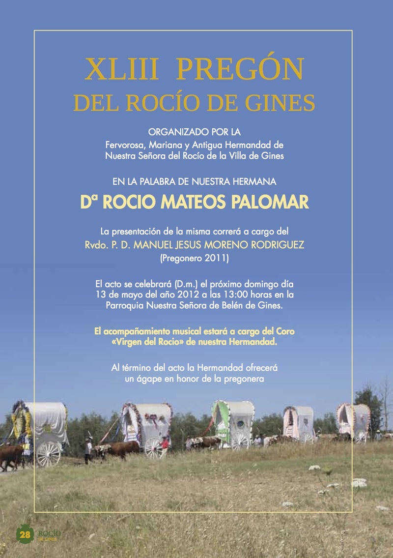 XLIII PREGÓN DEL ROCÍO DE GINES ORGANIZADO POR LA Fervorosa, Mariana y Antigua Hermandad de Nuestra Señora del Rocío de la Villa de Gines EN LA PALABRA DE NUESTRA HERMANA ROCIO MATEOS PALOMAR