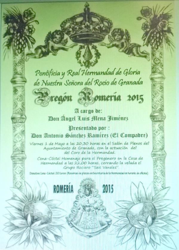 La Hermandad de Granada celebra su Pregón Rociero 2015 a cargo de D. Ángel Luis Mena Jiménez el día 1 de mayo de 2015.