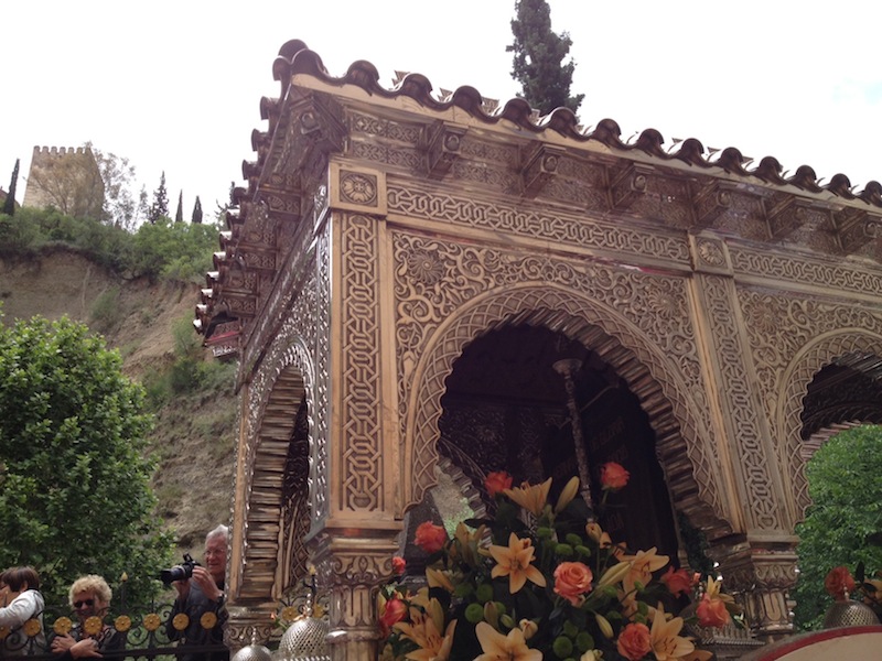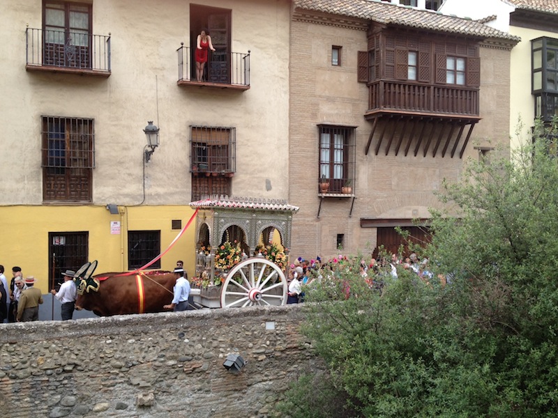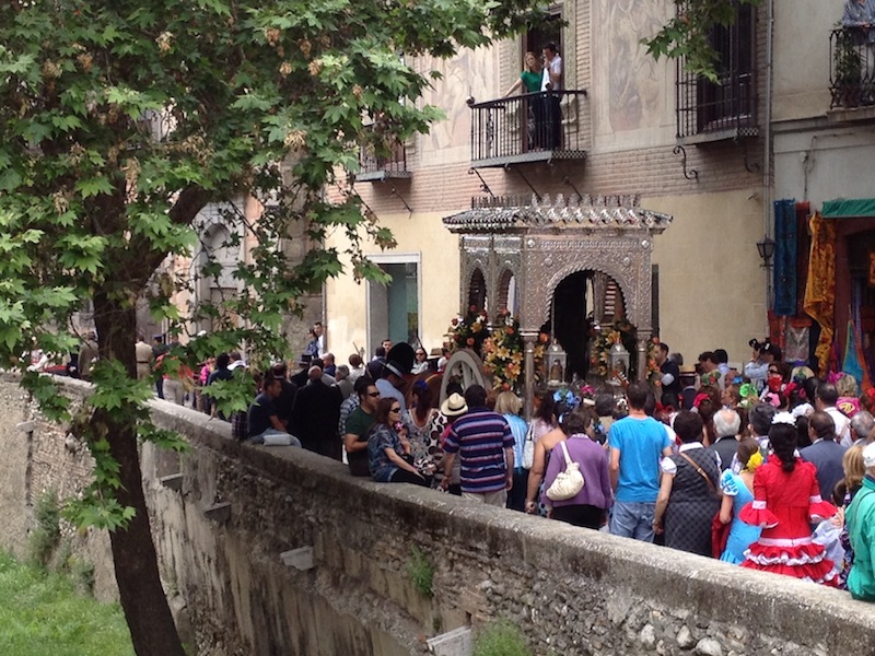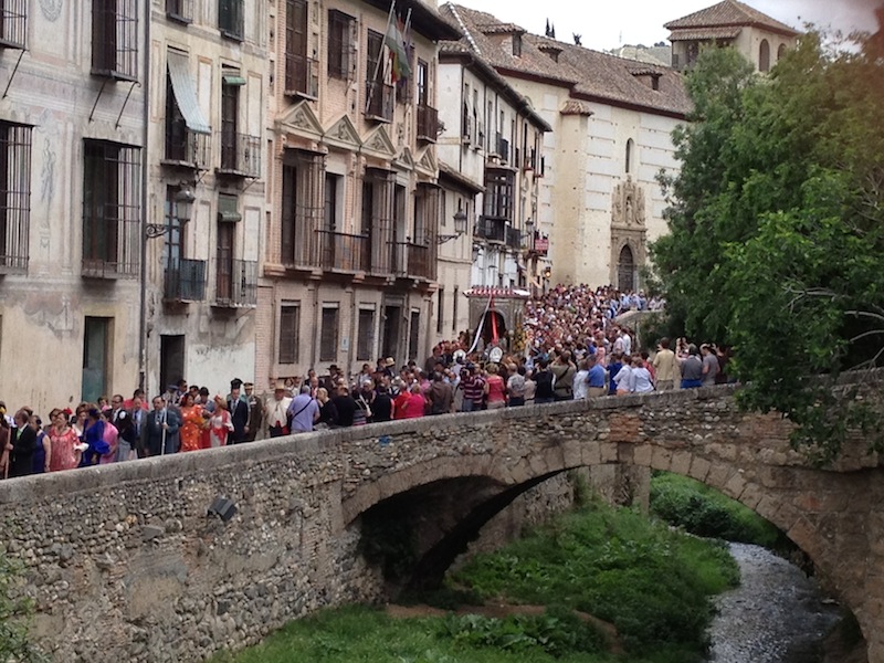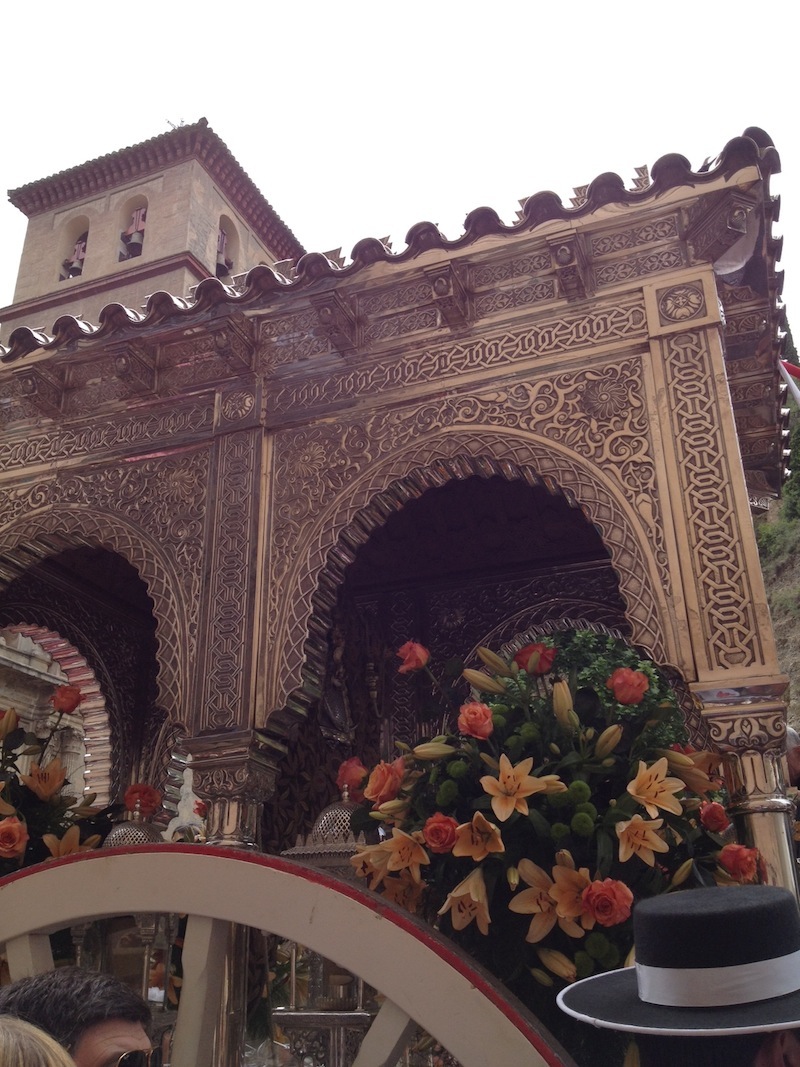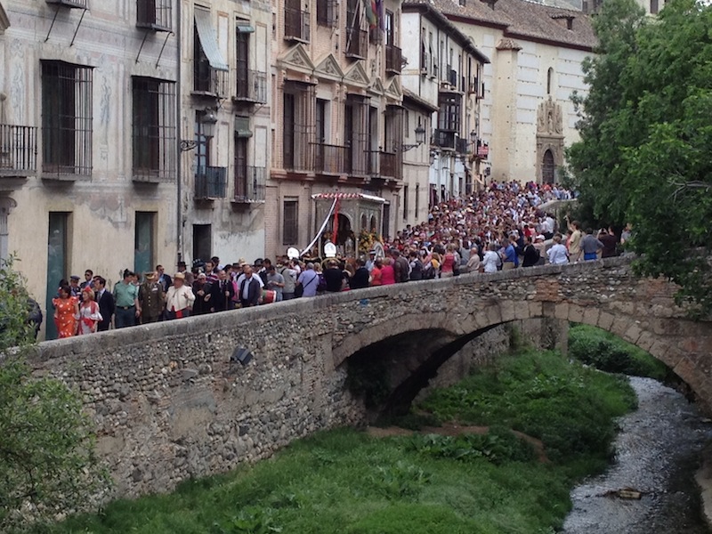 Tras la misa, comenzó la procesión por las calles del centro de la ciudad, con la despedida del Simpecado a la basílica de Nuestra Señora de las Angustias. Será el comienzo del camino de la hermandad de Granada hasta la aldea almonteña. El tradicional sesteo se hará en la Huerta del Rasillo, junto al Hipercor. A las 17,00 horas será la salida rumbo a Huétor Tájar, donde se pernoctará.