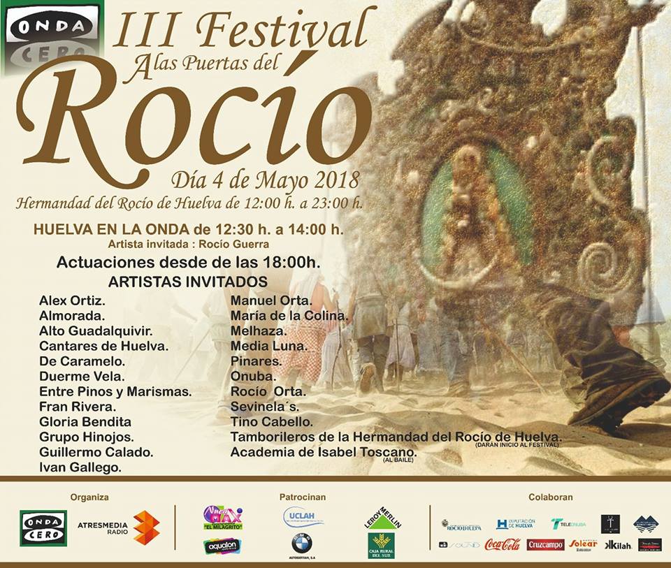 Este próximo viernes tenemos una nueva cita en nuestra Hermandad. En este caso, dentro del convenio de colaboración que ha firmado nuestra Hermandad con el Grupo Atresmedia, la cadena Onda Cero realizará en nuestra Casa de Hermandad el III Festival A las Puertas del Rocío.