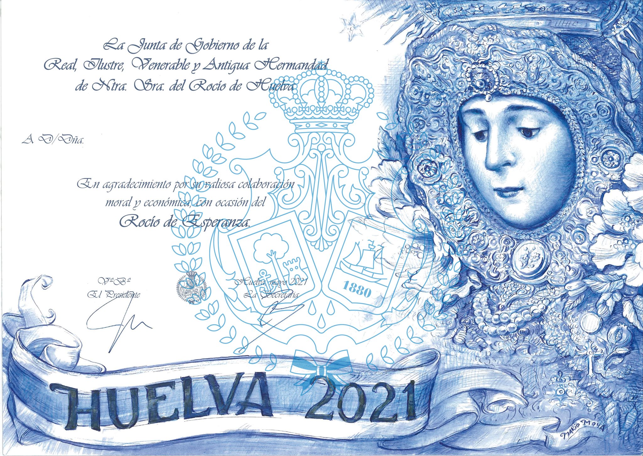 Para ello ponemos a disposición de todos los hermanos una inscripción extraordinaria, ilustrada para la ocasión por el artista y hermano de nuestra Hermandad Mario Ignacio Moya Carrasco, autor de numerosos carteles alusivos a la Romería, el anunciador de la misma en el año 2016 de la Hermandad Matriz de Almonte, el del 75 aniversario de la Bendición del Simpecado de Huelva en el año 2014, el anunciador de la Magna Rociera de Huelva en el 2018, o el recientemente editado anunciando los actos de “Huelva es Rocío”.