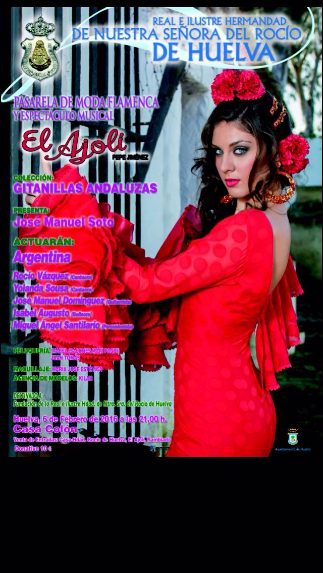 Cartel del desfile de la firma flamenca El Ajoli a beneficio de la Hermandad del Rocio de Huelva.