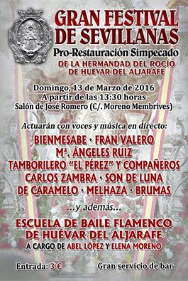 La Hermandad de Huevar del Aljarafe organiza un Gran Festival de Sevillanas Pro-Restauración del Simpecado el domingo 13 de marzo de 2016.