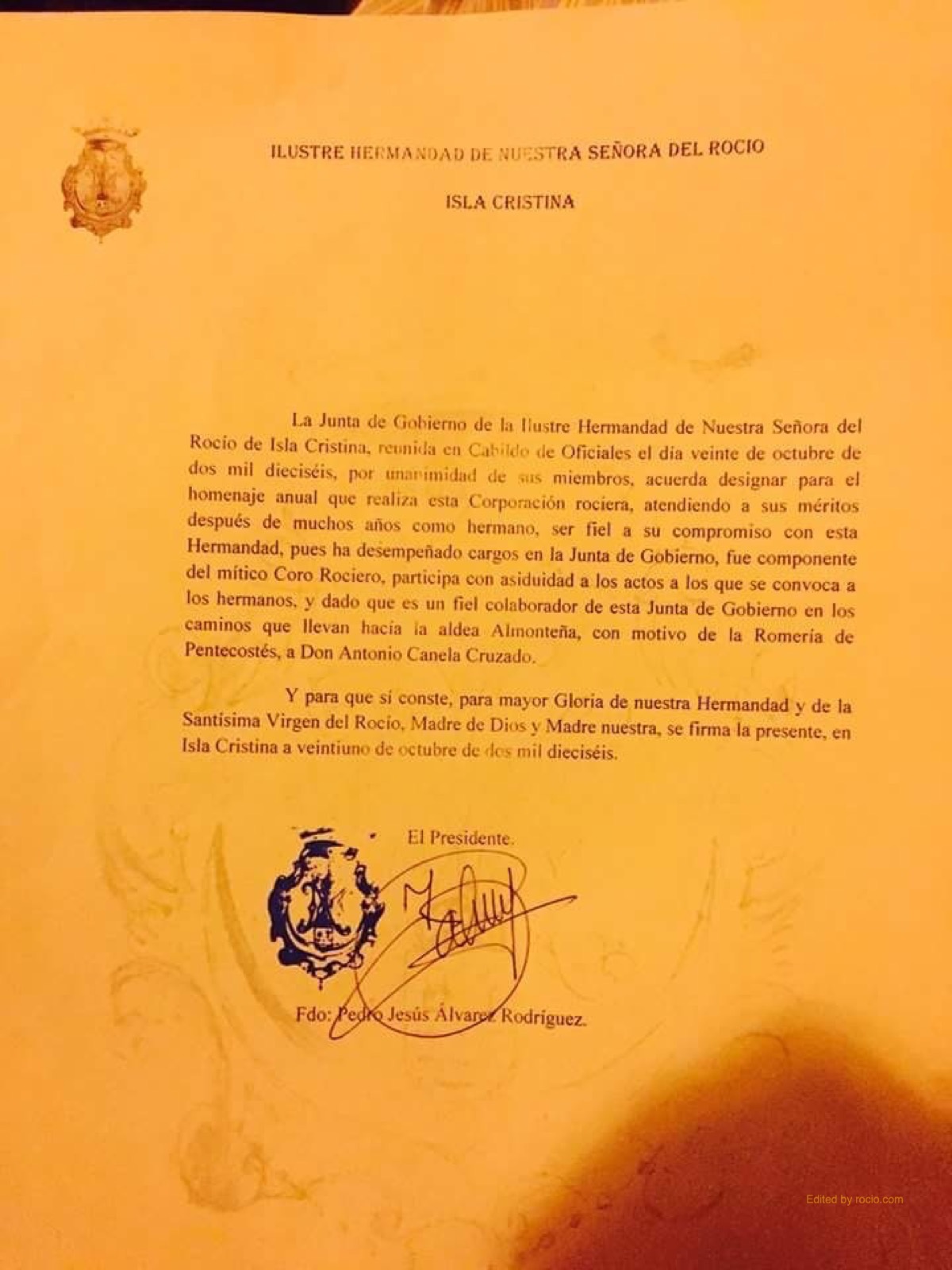 El pasado día 21 de Octubre, antes del comienzo de la Salve de ese día, la Junta de Gobierno de la Hermandad de la Hermandad del Rocío de Isla Cristina hizo pública su decisión de, como todos los años, en la Cena de Navidad que se organiza, homenajear a un hermano.