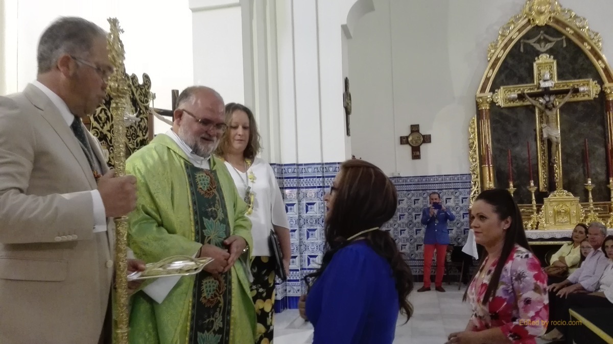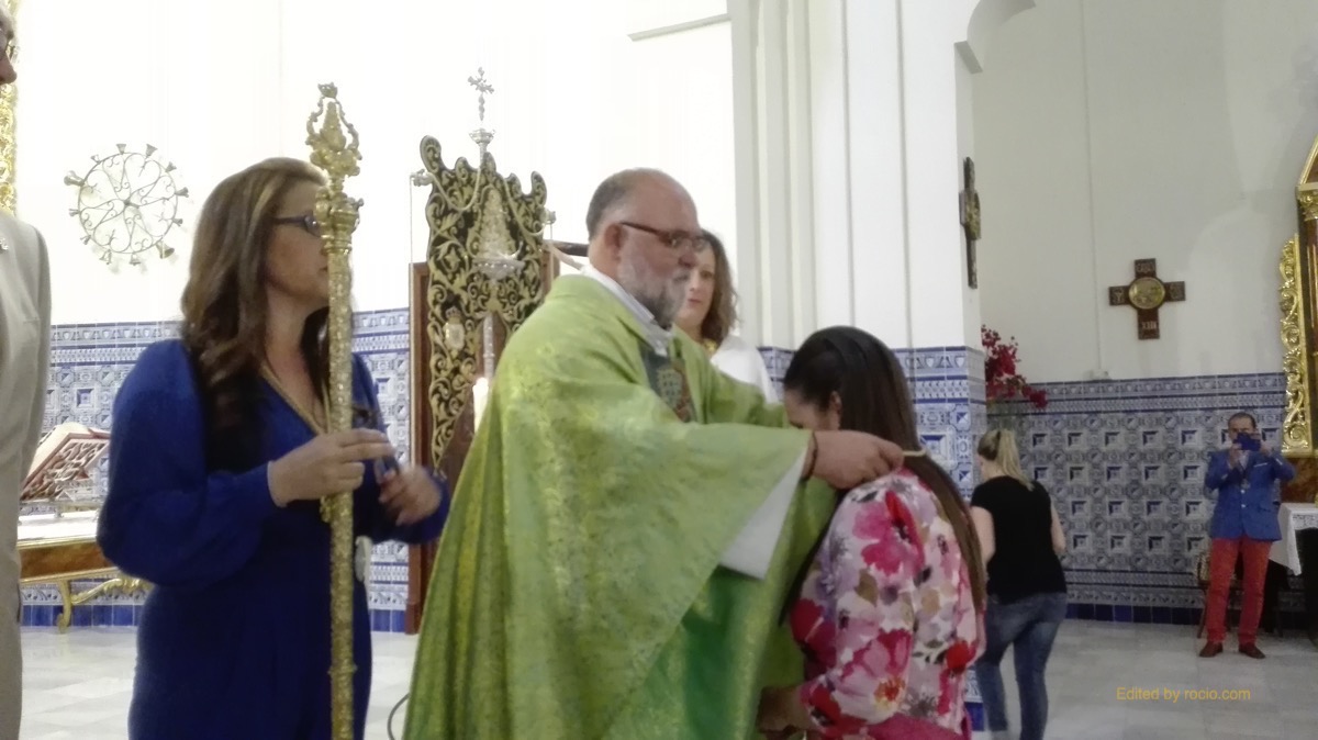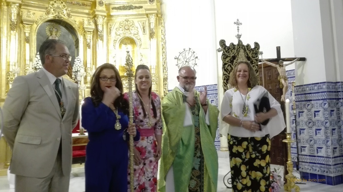 Y dentro de ese ambiente de alegría, apoyados con la oración cantada de «La Familia», tomaron posesión como Hermanas Mayores para la Romería 2017, Ana Jiménez Rodríguez y Esperanza Fernádez Rodríguez. Una emoción enorme la que se vivió, máxime cuando el Director Espiritual de la Hermandad, D. Juan Luís Vázquez les pidió templanza y tranquilidad en este año que representarán a la Hermandad y que ambas sean ejemplo claro de la presencia viva de Jesús y que lo disfruten. Y así, terminó esa Eucaristía con el canto de la Salve a la Santísima Virgen, al Pastorcito Divino y a la Hermandad en la voz de las hermanas mayores dando los vivas.