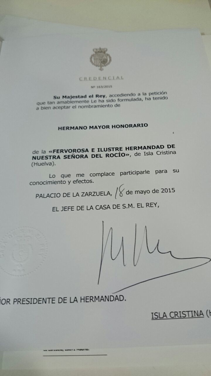 El pasado viernes día 3 de Julio, coincidiendo con el canto de la primera Salve de la temporada al Bendito Simpecado, en la Casa Hermandad del Rocío de Isla Cristina y aprovechando que un gran número de hermanos y hermanas estaban presentes, así como Autoridades Locales, el Presidente de la Hermandad, Pedro Jesús Álvarez, hizo pública la aceptación de Su Majestad el Rey Felipe VI de España del cargo de HERMANO MAYOR HONORARIO.