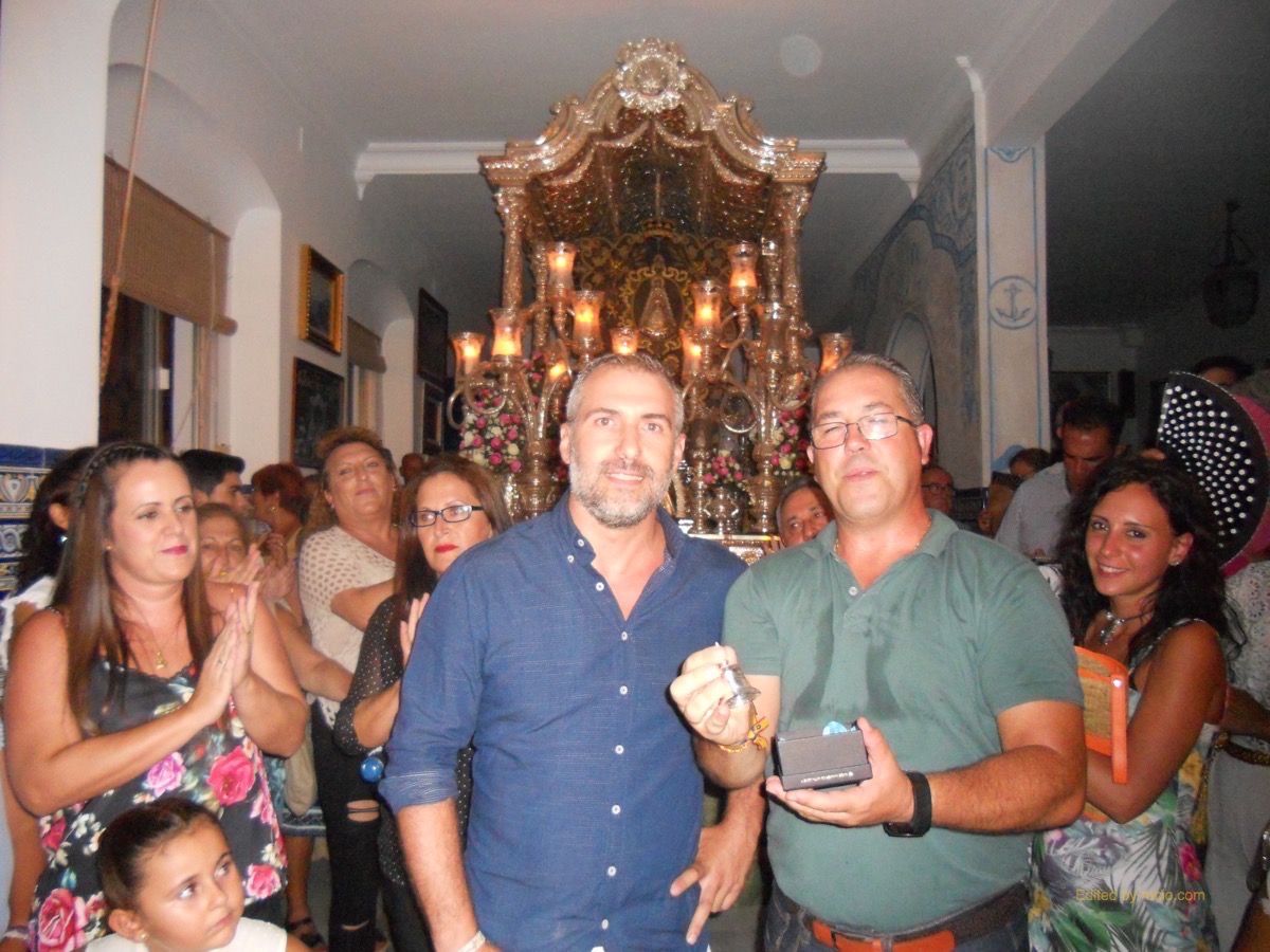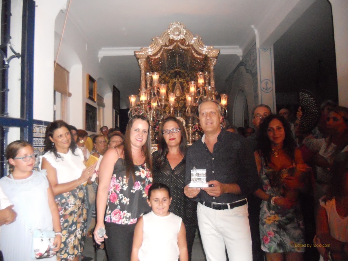 Javier Lancha, en nombre de la Casa El Tintineo recibe un regalo de la Hermandad de manos de las Hermanas Mayores.