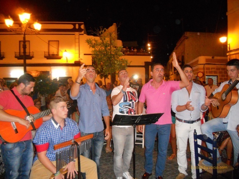 Anunciado estaba que el Grupo "Siempre Contigo" cantaría la Salve el pasado viernes día 29 de Agosto, pero fue una gran sorpresa cuando decidieron presentarse en ese momento como el grupo de Los Amigos al unirse a ellos los miembros del Grupo "Kalandraque". Así, todos juntos, interpretaron la Plegaria dedicada a la Virgen del Rocío que en otras ocasiones ya lo habían hecho, rompiendo, como siempre, las expectativas que de ellos se tienen porque lograron que muchos de los presentes la siguieran al ser una plegaria que no deja de dar gracias a la Madre de los rocieros por llenar la vida de los cristianos. Y a continuación, unas hermosas sevillanas en referencia a cuando en la Procesión del 2011 se rompió un varal del Paso de la Virgen y las diferentes Hermandades filiales tuvieron que acercarse a la Ermita para poder saludar a la Señora. Y con ellas quisieron acabar, pero todo el público les pidió que siguieran y con sevillanas sueltas rompieron el silencio de la noche con las fuertes ovaciones que recibieron Los Amigos.