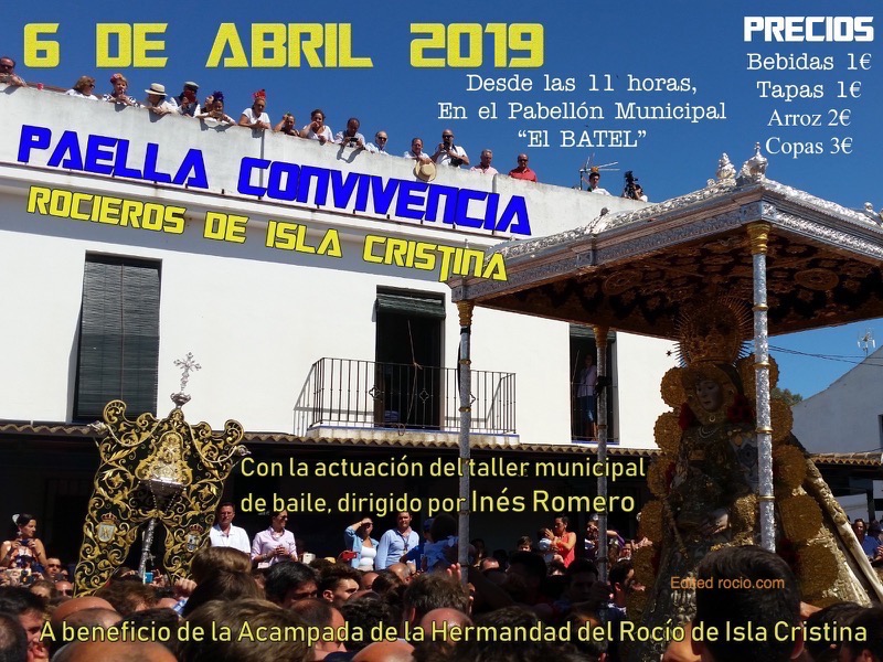El próximo SÁBADO 06 DE ABRIL, a partir de las 12,00 horas, en el Pabellón Municipal «EL BATEL», la Comisión de la Acampada de la Hermandad del Rocío de Isla Cristina organiza un ENCUENTRO, a beneficio de la misma, a la que están invitados, no sólo los rocieros, sino todos los isleños que deseen pasar un buen rato de Rocío.