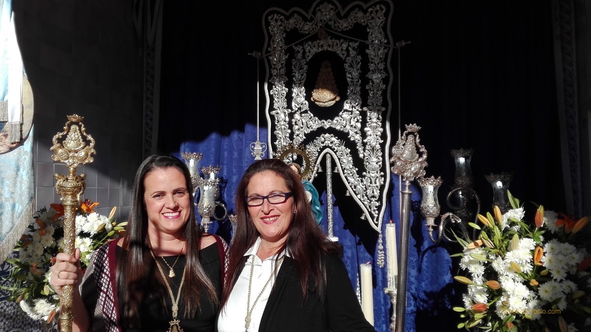 Las Hermanas Mayores, Ana y Esperanza, ante el Simpecado de la Hermandad de Palos de la Frontera