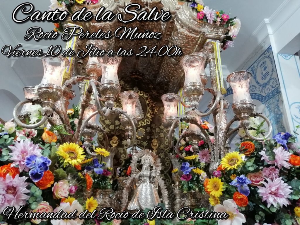 La Fervorosa e Ilustre Hermandad de Nuestra Señora del Rocío de Isla Cristina comunica que el próximo VIERNES DÍA 10 DE JULIO, a las 00’00 horas, cantará la SALVE al Bendito y Venerado Simpecado ROCÍO PERELES MUÑOZ en la Casa Hermandad de la Plazoleta San Francisco.