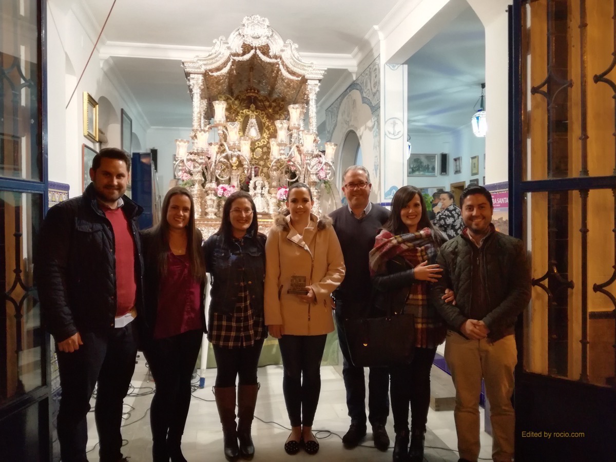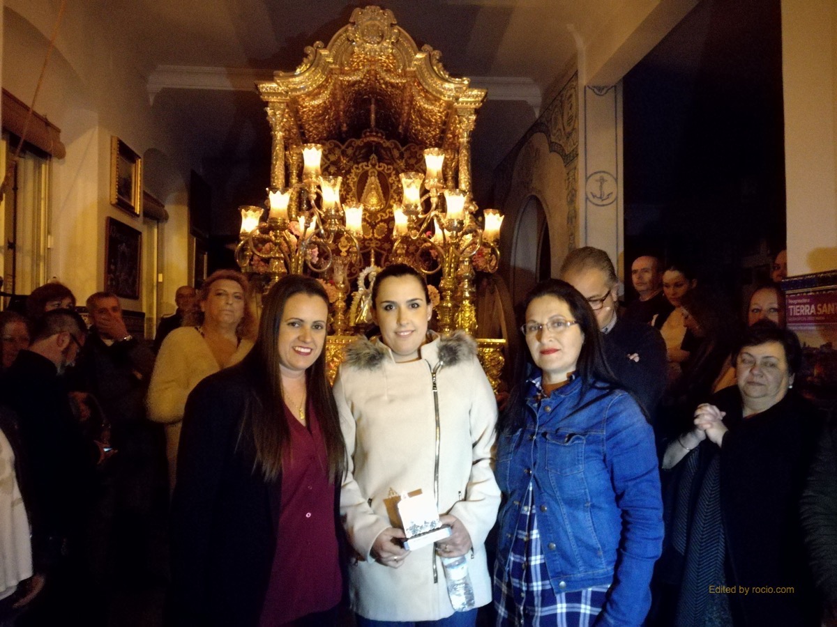 – Foto Salve Rocío 2: Las Hermanas Mayores, Ana y Esperanza, entregan a Rocío un detalle por parte de la Hermandad