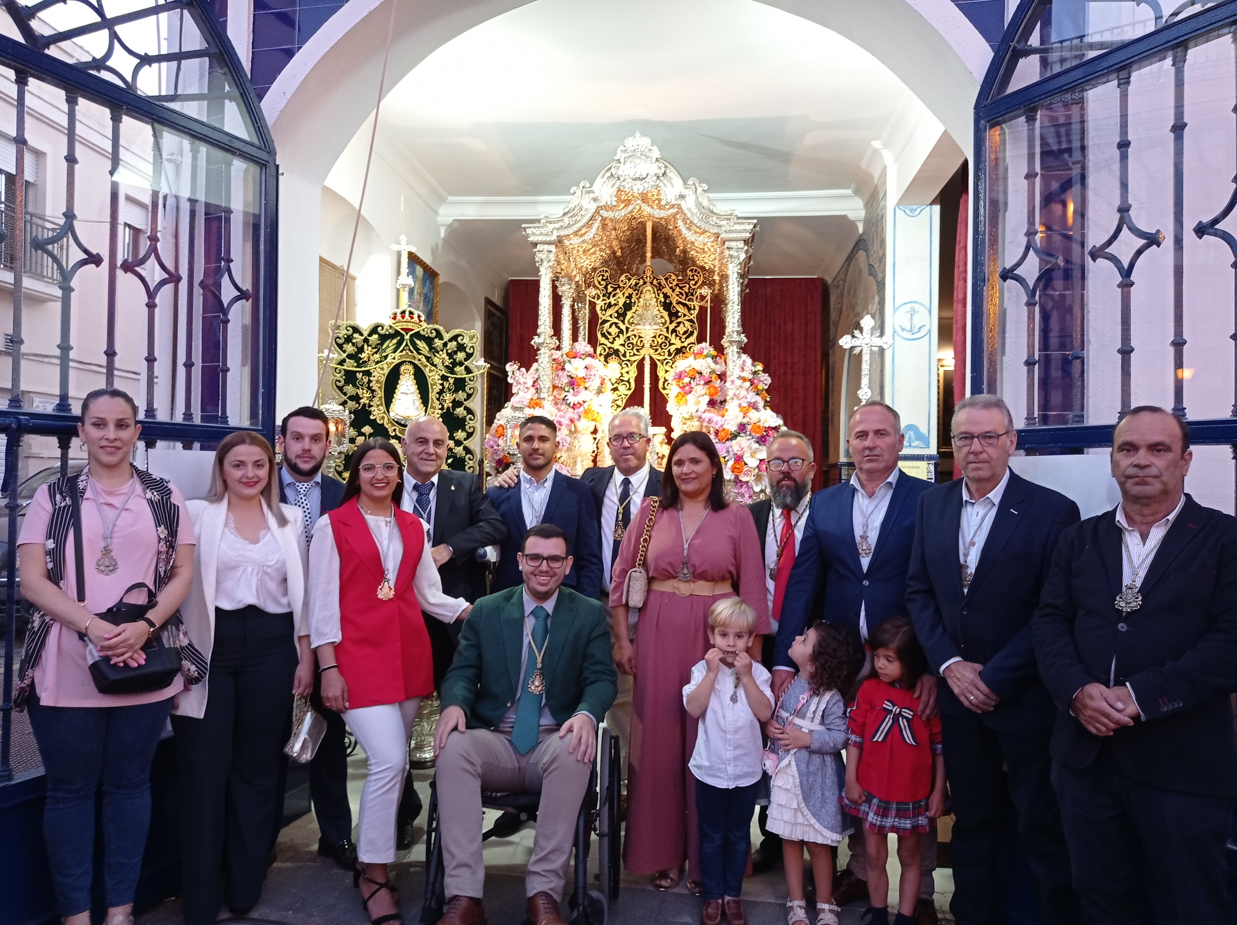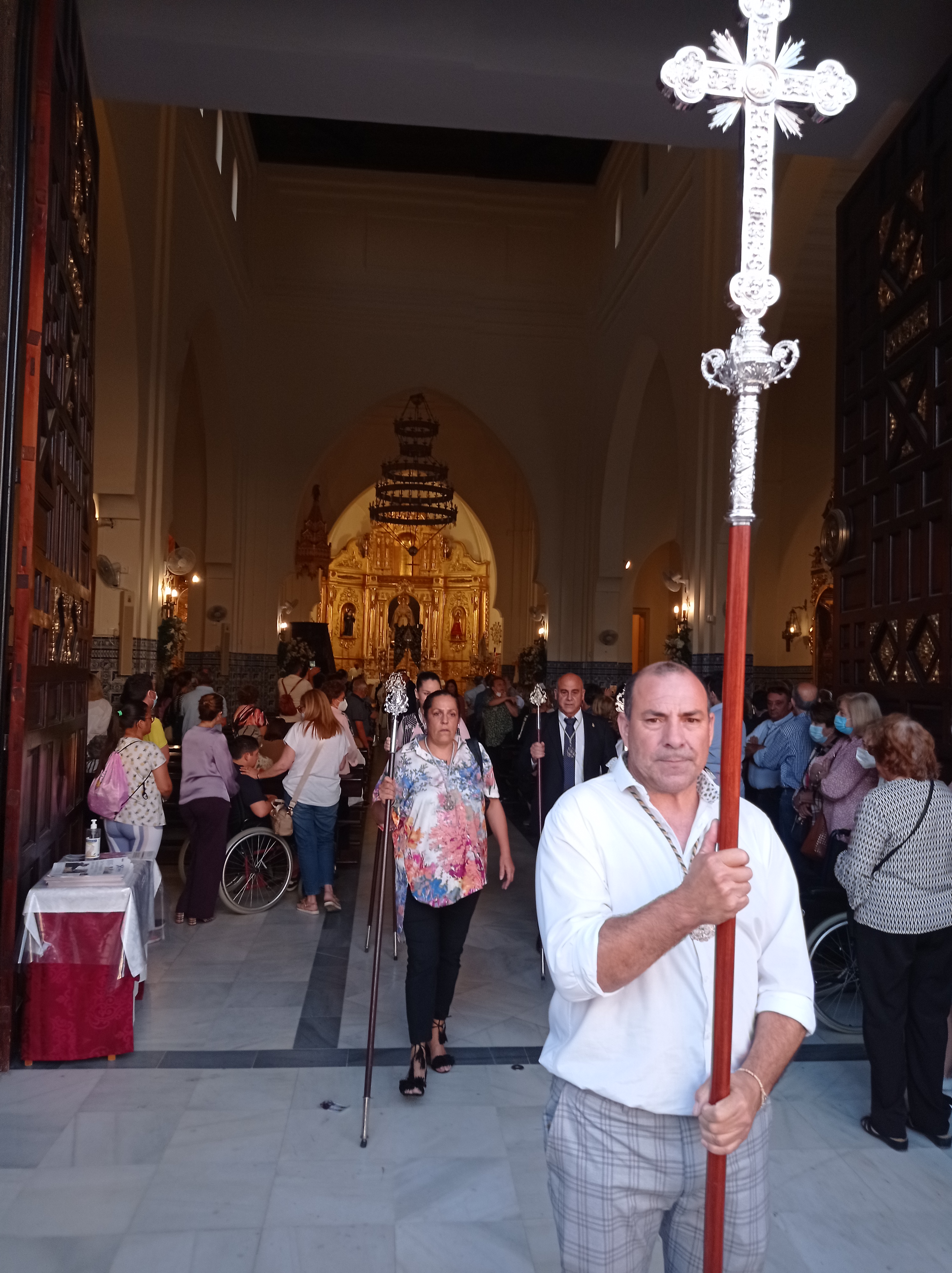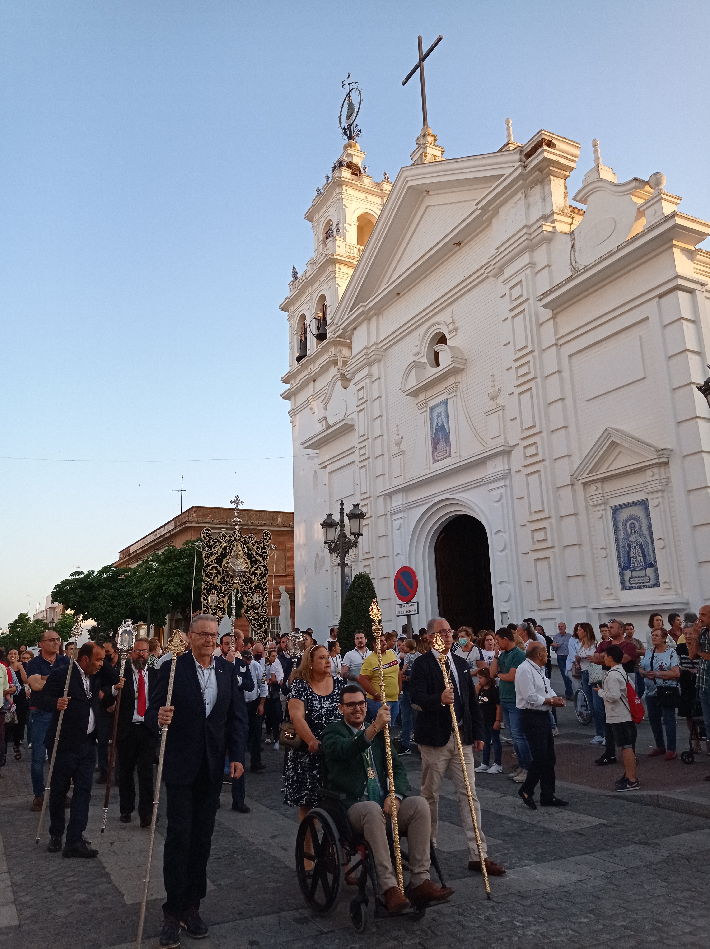Muchos hermanos y hermanas acompañaron al Simpecado en su recorrido hasta la Casa Hermandad, cuya comitiva iba encabezada por los magníficos Tamborileros José Manuel González Romero y Domingo Bravo a quienes seguía la Cruz de Guía, de madera y plata y realizada por el orfebre sevillano, Álvaro Fernández Ramos, que estrenaba la Hermandad.