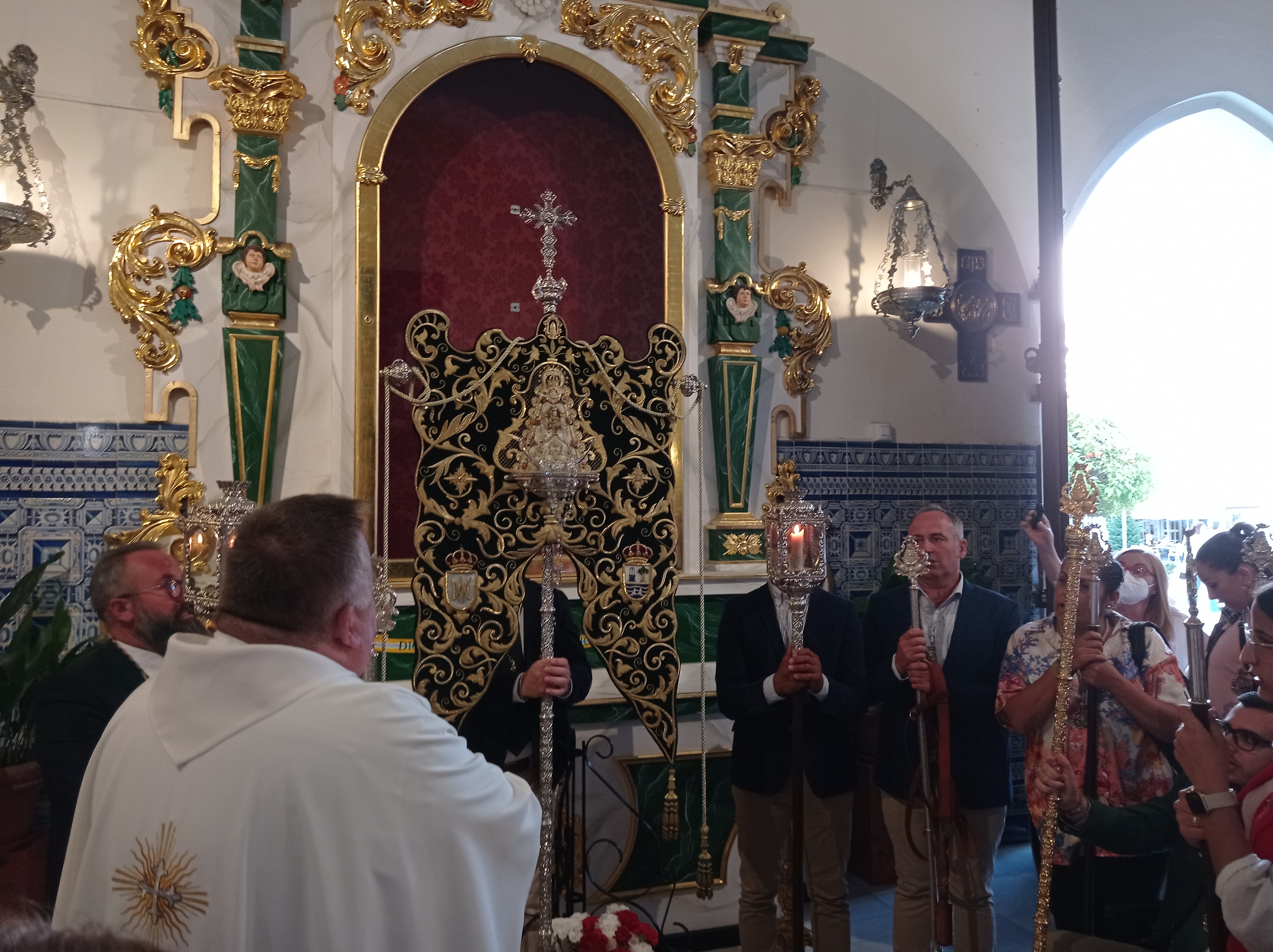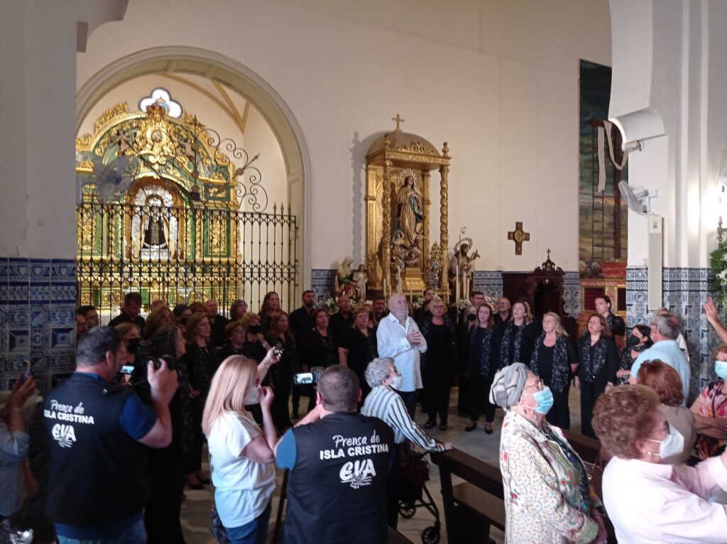 El Director Espiritual de la Hermandad, el Padre Gregorio, despidió al Simpecado con una oración a los pies de su altar y antes de salir del templo, la Coral Polifónica de Isla Cristina, dirigida por Vicente Sanchís, interpretó la Salve rociera.