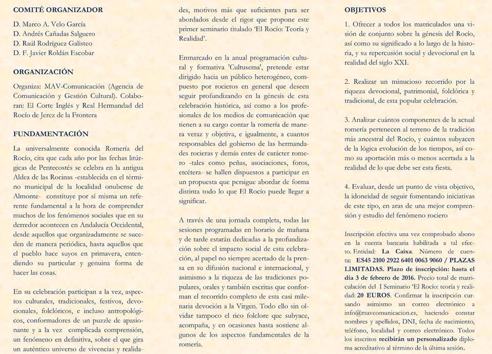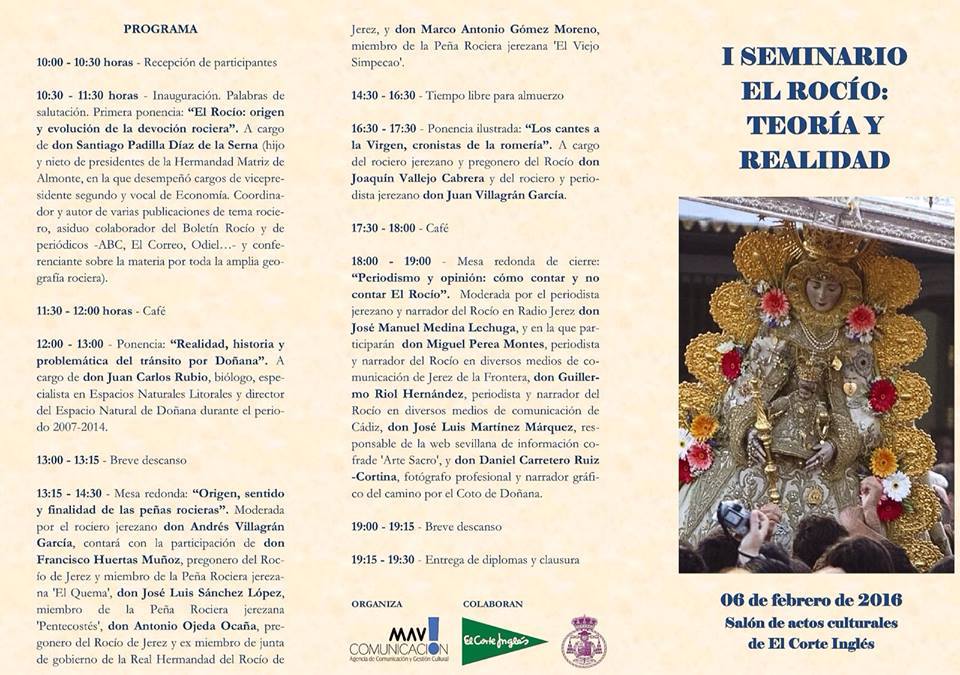 Os informamos que el próximo día 6 de febrero de 2016, en el salón de actos culturales de El Corte Inglés de Jerez de la Frontera tendrá lugar el I SEMINARIO “EL ROCIO: TEORIA Y REALIDAD”.