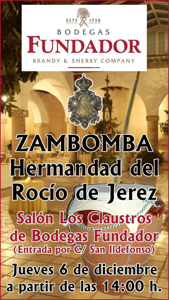 Queremos comunicaros e invitaros a la celebración de nuestra tradicional ZAMBOMBA NAVIDEÑA el próximo jueves día 6 de diciembre de 2018, a partir de las 14:00 horas, este año nuestra zambomba se celebrará en LA BODEGA LOS CLAUSTROS DE BODEGAS FUNDADOR (antigua Bodega Domecq), entrada por la cuesta del Espíritu Santo, donde podremos disfrutar de nuestros villancicos, actuaciones, variedad de guisos y unas copas de vinos de Jerez, a precios muy populares, y sobre todo la convivencia con nuestros hermanos/as, preparando la llegada del Pastorcito Divino.La entrada es gratuita.