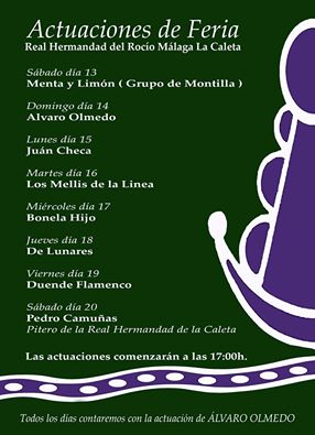 La Hermandad de La Caleta en su Caseta Oficial de la  Feria de Málaga ofrece las siguientes actuaciones a partir del sábado 13 de agosto de 2016.