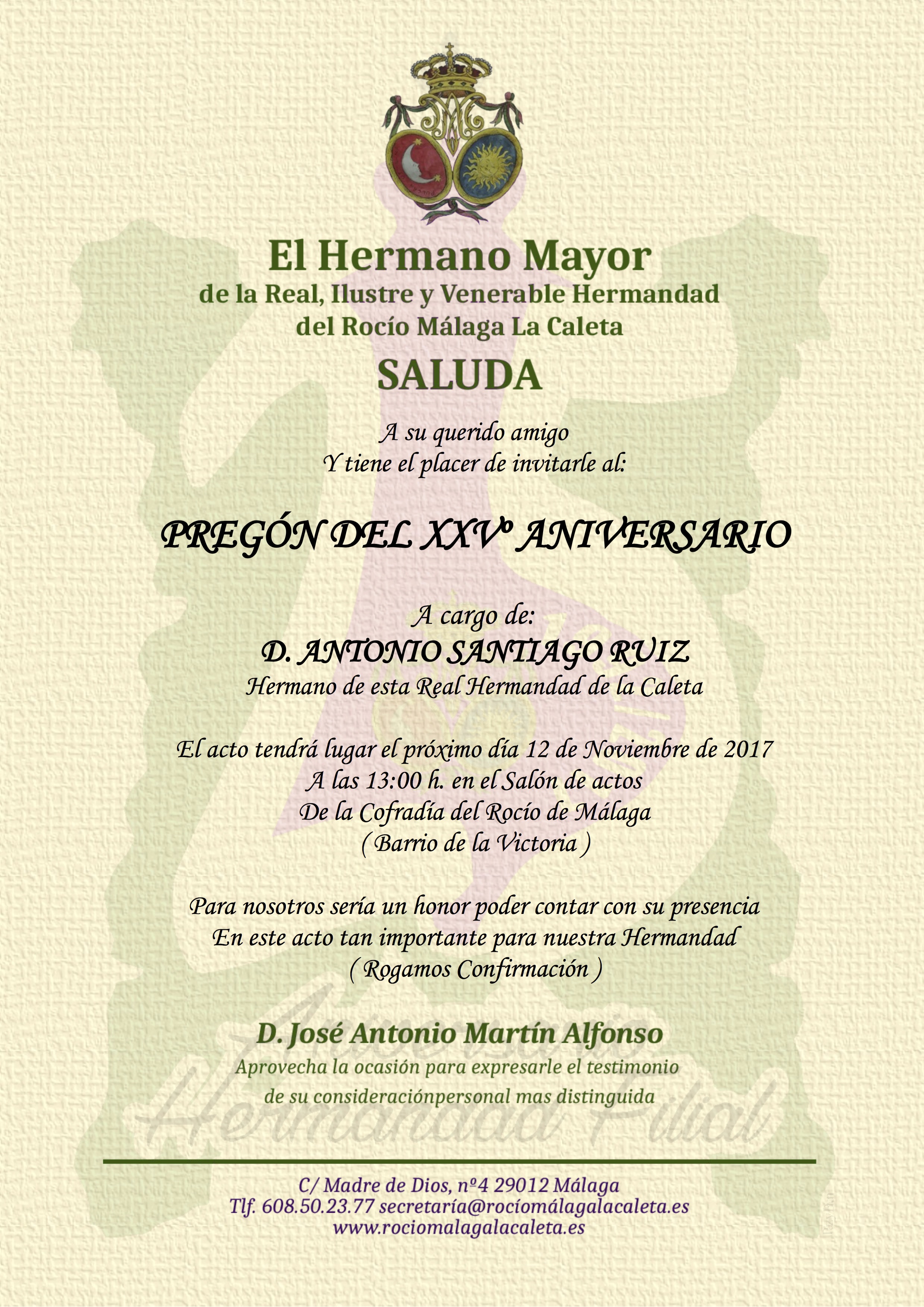 La Hermandad de La Caleta celebra su Pregón del XXV Aniversario a cargo de D. Antonio Santiago Ruiz el próximo 12 de noviembre de 2017