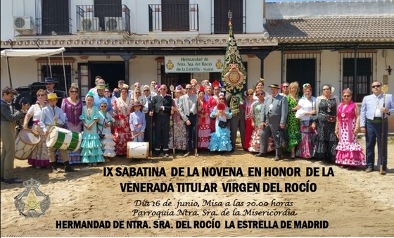 El sábado 16 de junio dará comienzo la IX Sabatina de la Solemne Novena que la Hermandad de Ntra. Sra. del Rocío la Estrella de Madrid consagra en honor de su venerada Titular, Virgen del Rocío. Tendrá lugar en nuestra Parroquia de Ntra. Sra. de la Misericordia de Madrid, C/ Arroyo del Olivar, 100, a las 19:30 horas con este orden: Santo Rosario, ejercicio de la Novena y celebración de la Eucaristía. Oficiará nuestro Consiliario Rvdo. P. D. José Luengo Coloma. Cantará el coro de nuestra Hermandad.