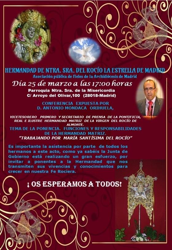 El sábado 25 de marzo, dará comienzo la VII Sabatina de la Solemne Novena que la Hermandad de Ntra. Sra. del Rocío la Estrella de Madrid celebra en honor de su venerada Titular, la Virgen del Rocío. Tendrá lugar en nuestra Sede Canónica Parroquia de Ntra. Sra. de la Misericordia de Madrid, C/ Arroyo del Olivar, 100,