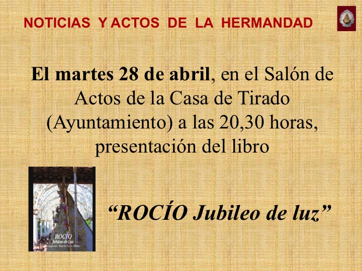 · A las 20’30 horas. Presentación del libro Rocío. Jubileo de luz en el Salón de Actos del Excmo. Ayuntamiento.