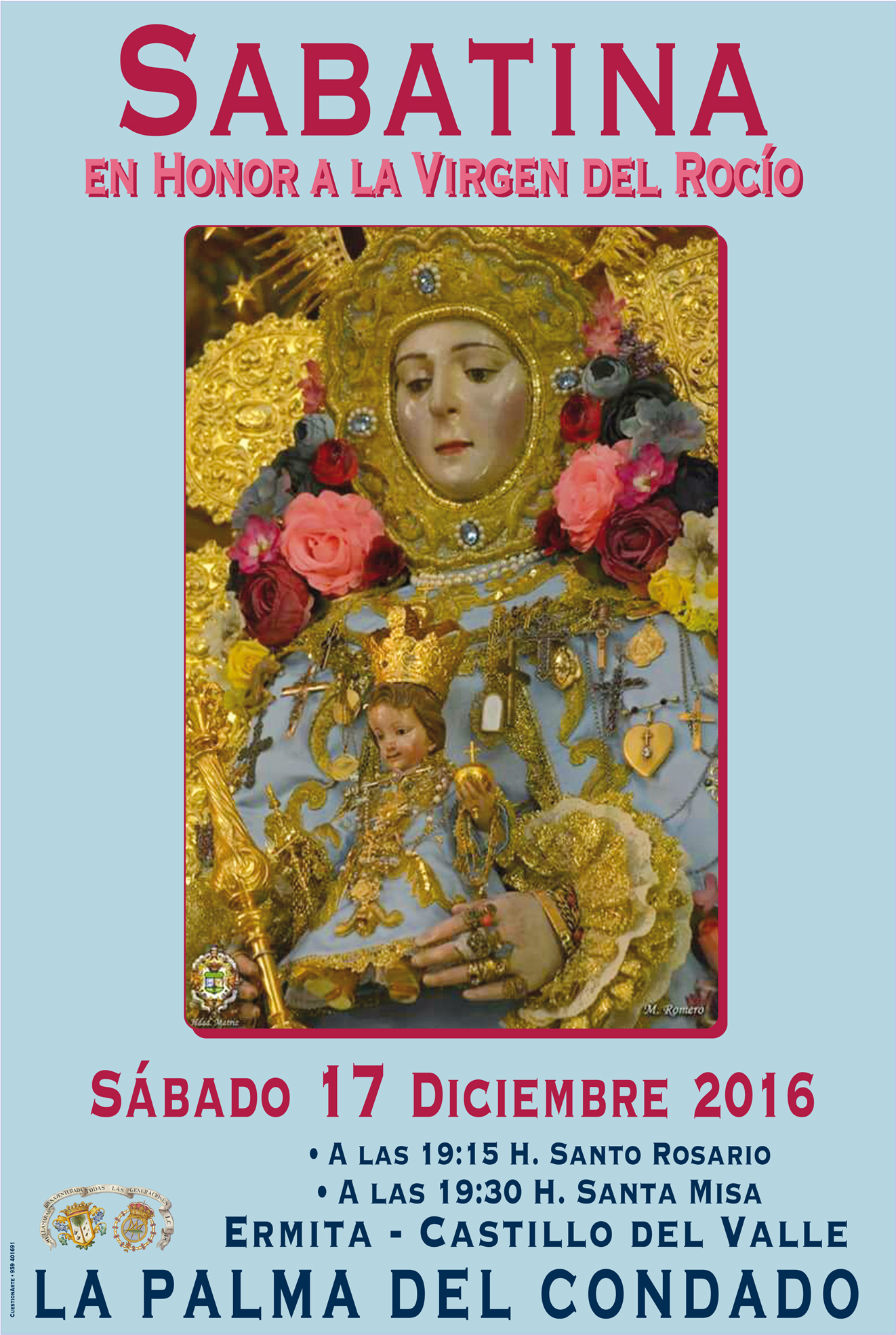 La Sabatina en Honor a la Virgen del Rocío que celebra Nuestra Hermandad cada último sábado del mes en Diciembre se celebrará el sábado 17 por coincidir con Noche Vieja el ultimo sábado y con Navidad el penúltimo sábado.