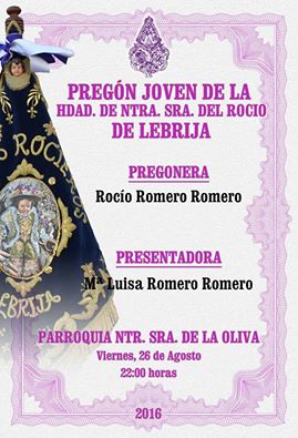 La Hermandad de Lebrija celebra el próximo 26 de agosto su Pregón Joven a cargo de Rocío Romero que será presentada por Mª Luisa Romero.