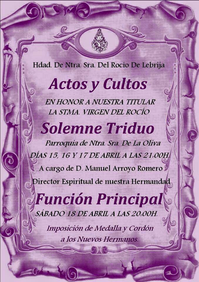 La Hermandad de Lebrija celebrará Solemne Triduo 2015 durante los días 15,16, y 17 de abril 2015.