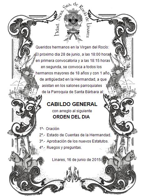 La Hermandad de Linares  celebra Cabildo General el próximo 28 de junio de 2015.