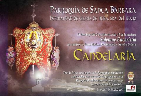 Anunciamos los próximos eventos que celebraremos el próximo día 5 de febrero, domingo. A las 11h nos uniremos en torno al altar de nuestra Parroquia de Sta. Bárbara para celebrar Solemne Eucaristía con motivo de la Candelaria. Una vez finalizada la misa, la Hermandad organizará una Candela Rociera Solidaria, cuya entrada será «pagada» con un kg o un litro de alimentos no perecederos, destinados a la bolsa de caridad de nuestra parroquia. Habrá, además, actuaciones de grupos rocieros y una barra donde consumir bebidas a precios populares. ¡Seguiremos informando!