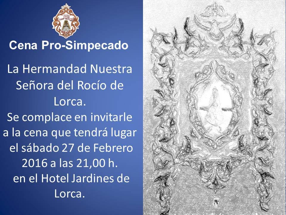 La Hermandad Nuestra Señora del Rocío se complace en invitarle a la cena que tendrá lugar el sábado día 27 de febrero de 2016, a las 21:00 h. en el Hotel Jardines de Lorca.