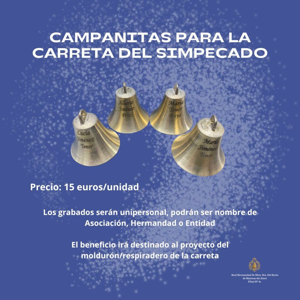 Están a disposición de todos nuestros hermanos, devotos, vecinos y amigos que así lo deseen, campanitas con el nombre grabado, que irán en el cajón de nuestra Carreta del Bendito Simpecado en el próximo camino.