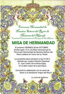 La Hermandad de Mairena del Aljarafe celebra su Misa de Hermandad el próximo viernes 28 de octubre de 2016