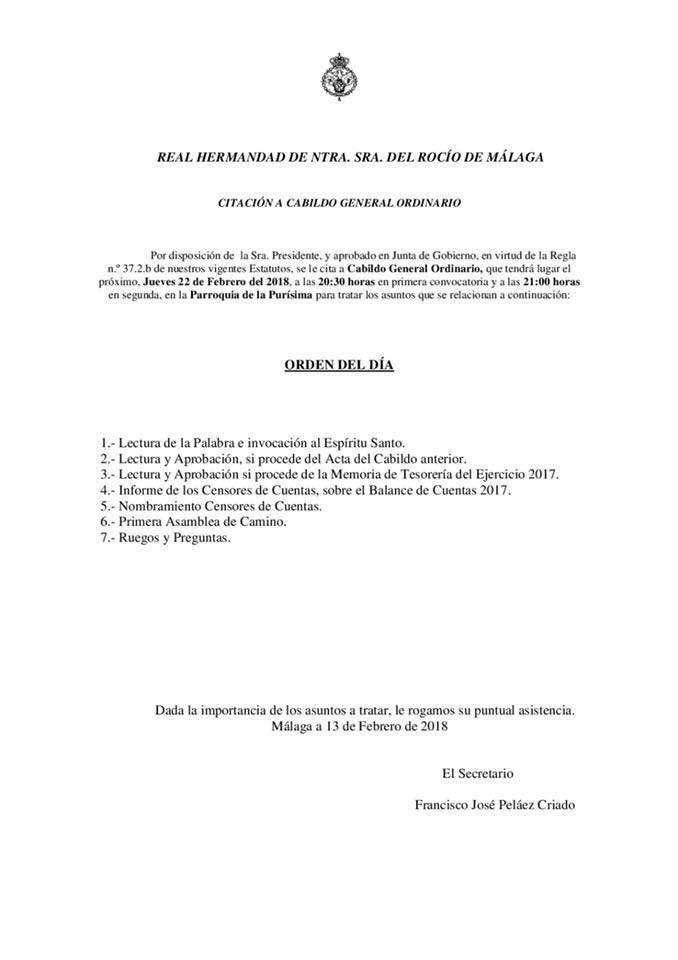 La Hermandad convoca a todos sus hermanos para el Cabildo General Ordinario de Cuentas que se celebrará (D.m.) el próximo jueves 22 de febrero a las 20,30 horas en primera y a las 21,00 horas en segunda convocatoria, en nuestra Sede Canónica la Parroquia de la Purísima Concepción. Esperando contar con su asistencia rogamos puntualidad.