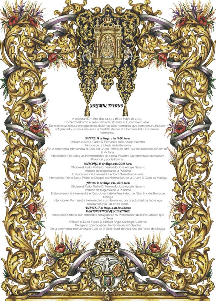 La Real Hermandad de Ntra. Sra. Del Rocío de Málaga, consagra en Honor y Gloria a Maria Santísima del Rocío los proximos 14, 15 y 16 de Mayo en la Parroquia de la Purisima Concepcion. La funcion principal se realizará el Viernes 17 de Mayo.
