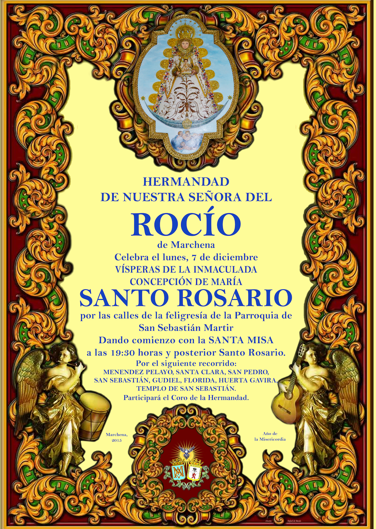 La Hermandad de Nuestra Señora del Rocío de Marchena. Informa que este próximo lunes 7 de diciembre, vísperas de la Inmaculada concepción de María, realizará el rezo del Santo Rosario por la feligresía de la parroquia de San Sebastián Mártir dando comienzo con la Santa Misa a las 19:30 y posterior rezo del Santo Rosario. Dicho Rezo discurrirá por las siguientes calles: Plaza San Sebastián, Menéndez Pelayo, San Pedro, San Sebastián, Gudiel, Florida, Huerta Gavira, entrada templo Parroquial.
